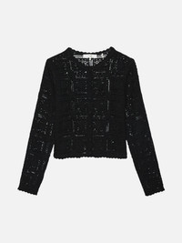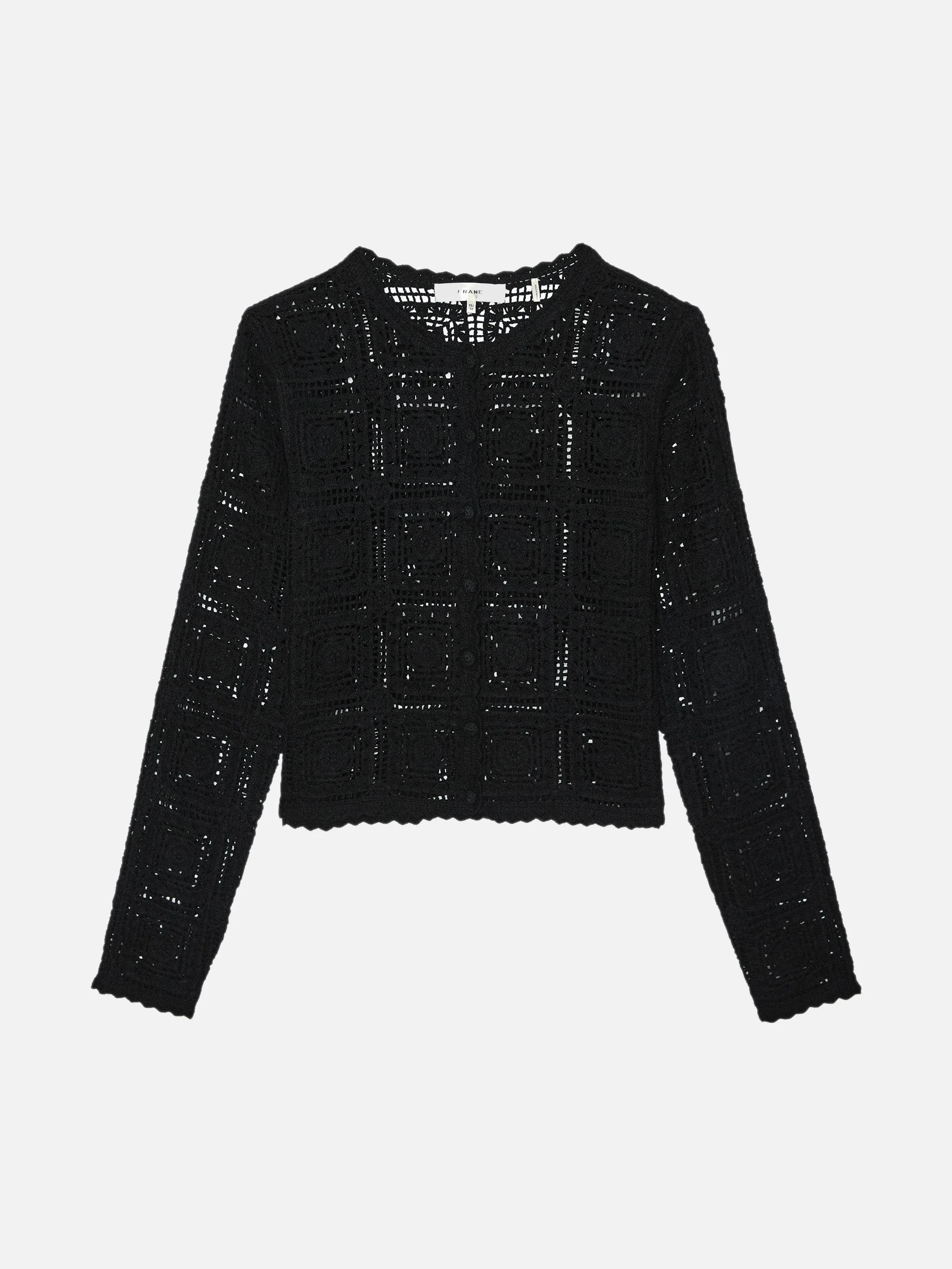 Intricately crocheted from pure cotton, this cardigan features a geometric open-knit pattern and scalloped edges throughout. Finished with self-covered buttons for a thoughtful touch, it’s a breathable layer that marries vintage character and modern charm. Materials & Care Dry Clean Only 100% Cotton 19.5" Long From Shoulder WE25KSW008-BLK