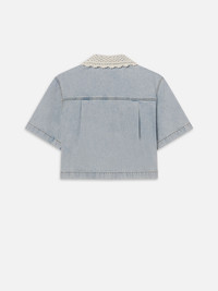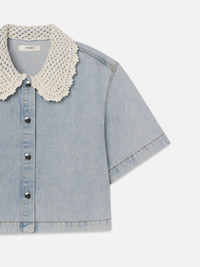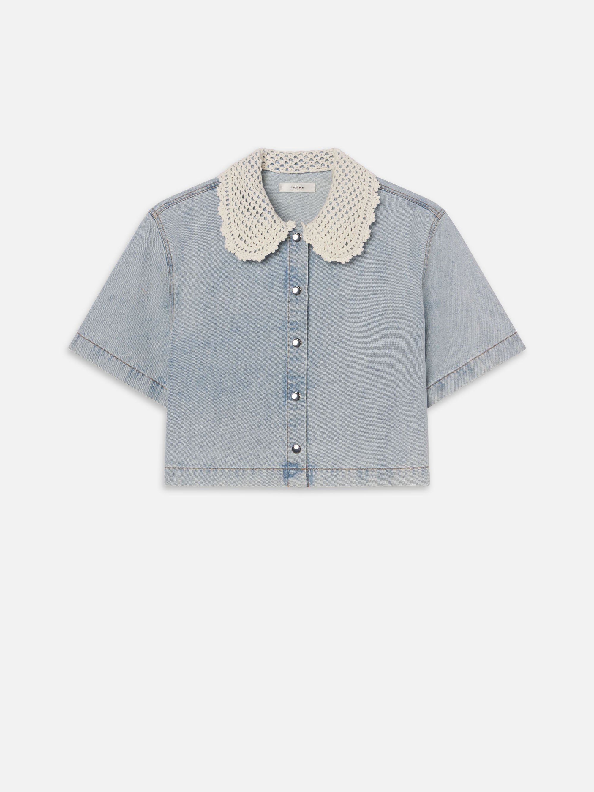 A boxy denim top with crisp short sleeves, cut from lightweight, rigid denim and washed to a soft pale blue for a worn-in feel. Finished with shiny silver snaps and a scalloped crochet collar that adds a touch of texture—and a hint of sweetness. Materials & Care Dry Clean Only 20" Long From Shoulder 7011CR967-FLDA