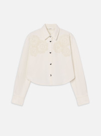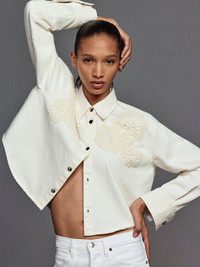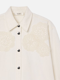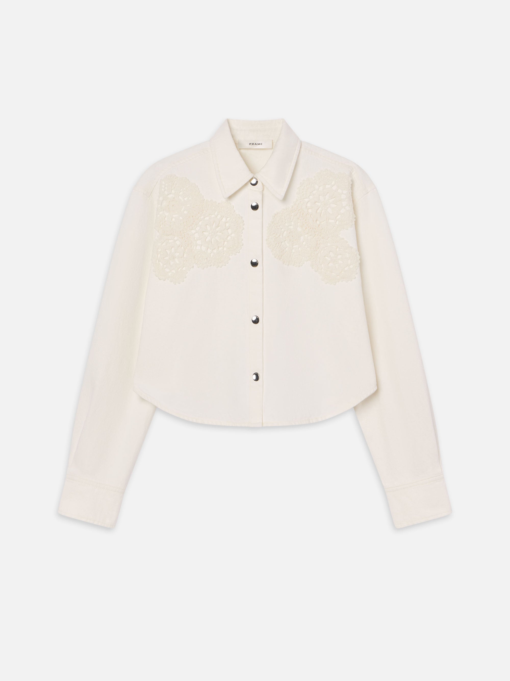 This rigid denim shirt features a swingy, slightly cropped shape with long sleeves and shiny silver snaps. Crochet doilies add unexpected texture and charm to a structured silhouette—designed to balance denim or form a coordinating set with the Crochet Dare Short. Materials & Care Dry Clean Only 100% Organic Cotton 20.5" Long From Shoulder 7003CR457-AUCL