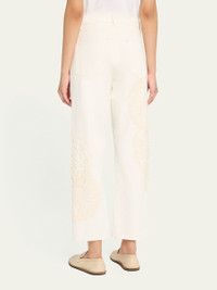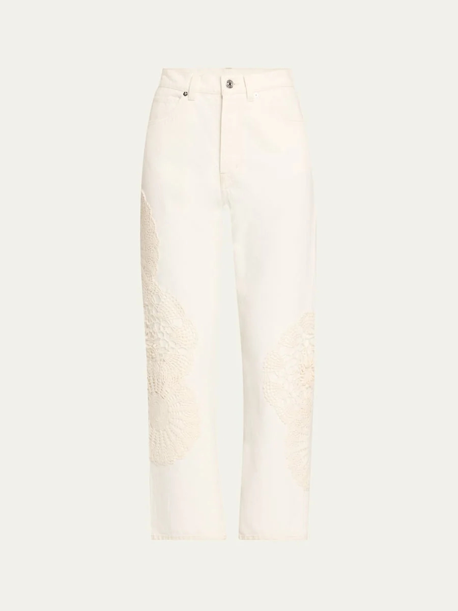 FRAME "The Crochet Vertical Crop" jeans in white denim Approx. 11.5" rise; 27" inseam High rise Five-pocket style Straight legs Cropped length Button/zip fly; belt loops Cotton Dry clean only Imported Online Inquiries: BGS21_T6Q5F| Store Inquiries: #5023607