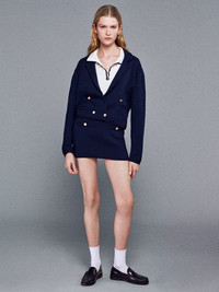 Sail into spring with The Cruise Cardi. Tailored to a relaxed, double-breasted silhouette, the wool piece serves as a jacket with notched lapels, gold-toned buttons and tonal welt pockets at the chest. Embrace its vintage inspirations and complete the look with The Cruise Skirt. Materials & Care Dry Clean Only 100% Wool 20.25" Long From Shoulder WS25KJA001-DKNV