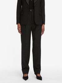 This trouser features a sleek self-belt with subtle hardware for a feminine take on tailored suiting. Designed with pleats down the leg, side pockets, and a tacked cuff at the hem. Pair it with the Peak Lapel Blazer for a modern set. Materials & Care Dry Clean Only 53% Polyester/43% Virgin Wool/4% Elastane 13.25" Front Rise/31" Inseam/15.5" Leg Opening WF25WPA001-BLK