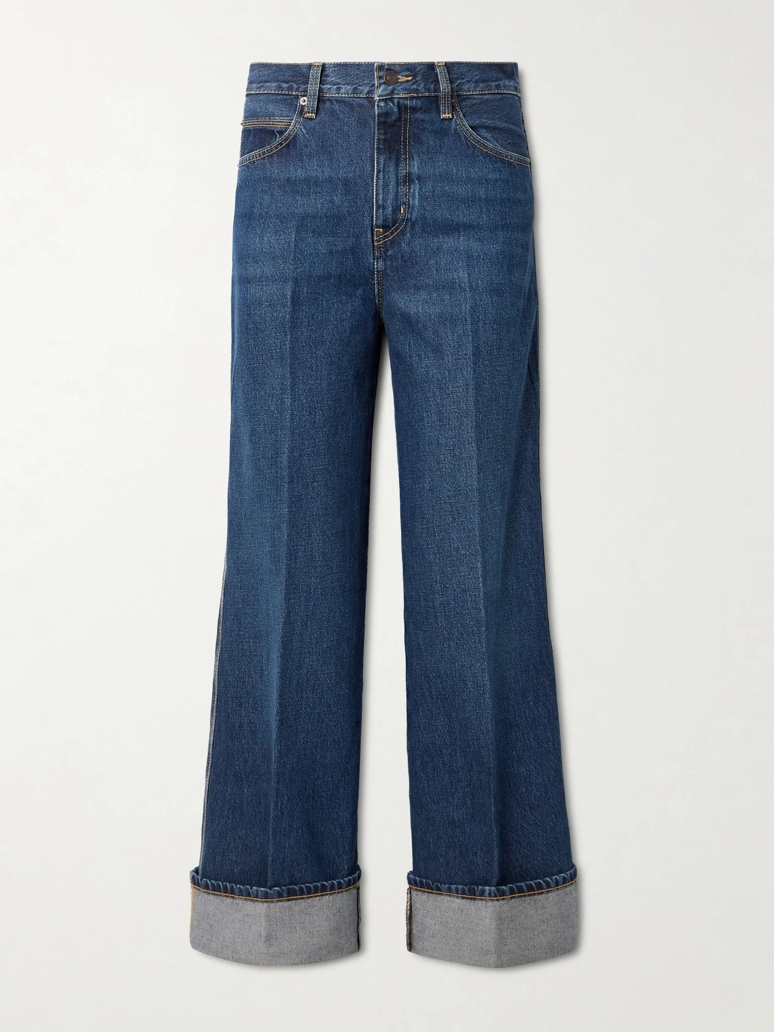 FRAME was founded by Jens Grede and Erik Torstensson, when the two worked together to create the perfect pair of blue jeans. These ones are cut from the brand's rigid denim with wide legs and cuffed hems that can be unfolded for a longer inseam. Tuck a tank into the mid-rise waist. Lower-Impact Materials. This product is made using at least 50% lower-impact materials or ingredients. Find out more about our NET SUSTAIN criteria here. Size & Fit - Fits true to size, take your normal size - Mid-rise, cut for a wide-leg fit - Mid-weight, non-stretchy fabric - Size 26 jeans have an inside leg of 33"/ 86cm - Model is 177cm/ 5'10" and is wearing a size 26 Model measurements: - Bust: 77cm/ 30.5" - Waist: 62cm/ 24.5" - Hip: 88cm/ 34.5" Details & Care - Dark-blue denim - Button and concealed zip fastening at front - 100% cotton - Machine wash - This product has been made with regenerative cotton, supporting holistic farming practices that increase soil health, improve biodiversity and reduce carbon emissions