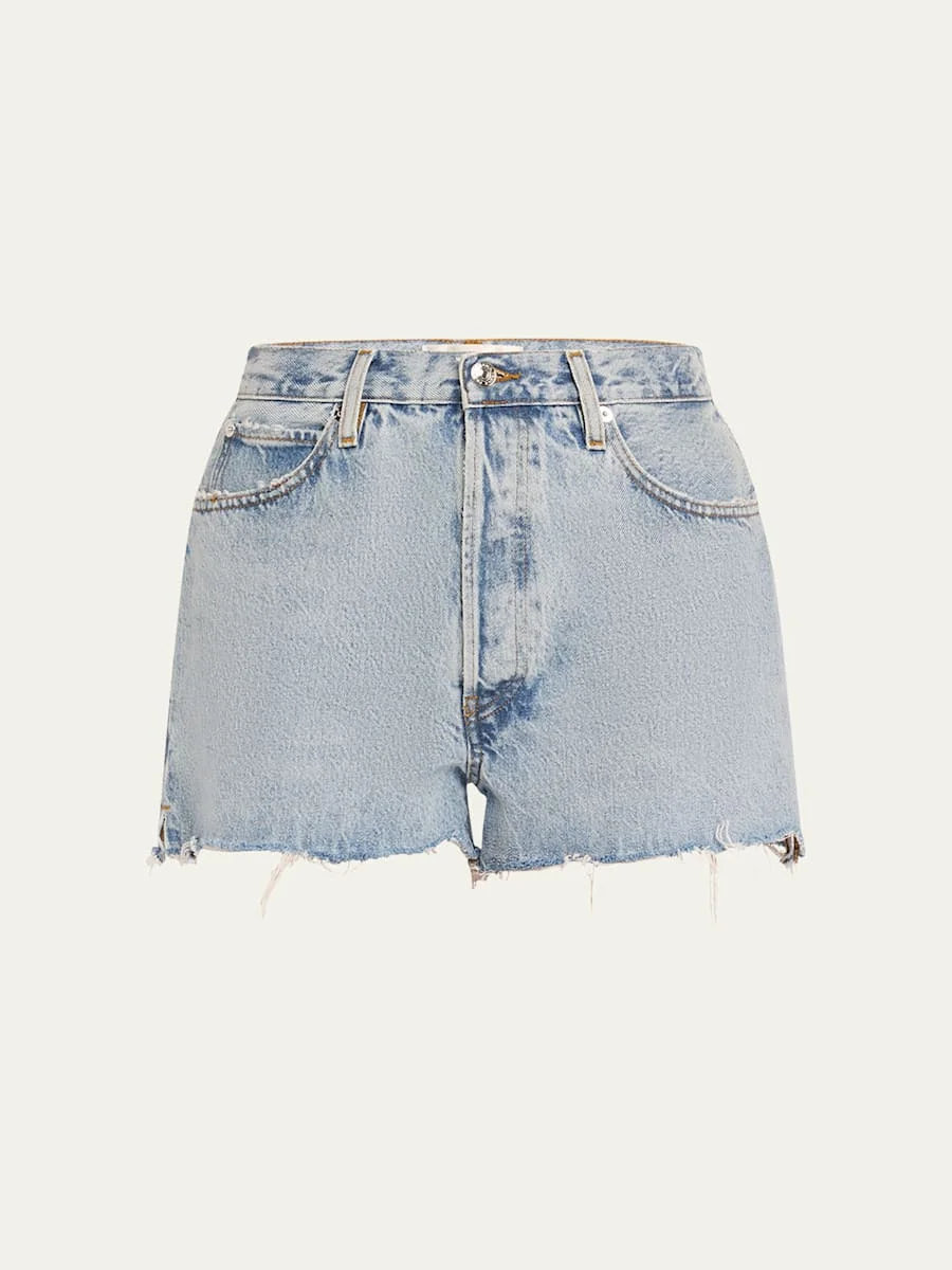 FRAME "The Dare" cut-off shorts in light-wash denim Approx. 2.5" inseam; 12" rise High rise Five-pocket style Classic fit Button/zip fly; belt loops Cotton Machine wash cold inside out Imported Online Inquiries: BGS21_T6TSR| Store Inquiries: #5034129