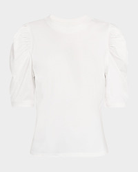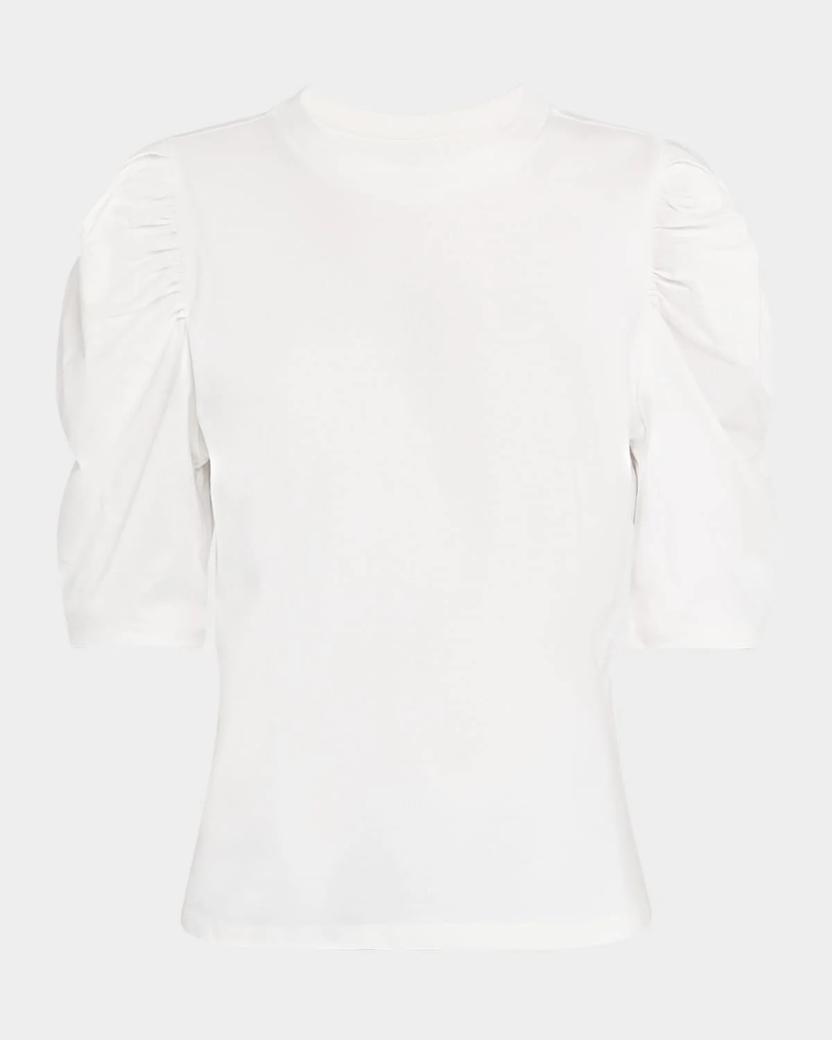 - FRAME cotton teel featuring draped puff sleeves - Crew neckline - Easy fit - Hem sits at the hip - Pullover style - Cotton - Made in USA