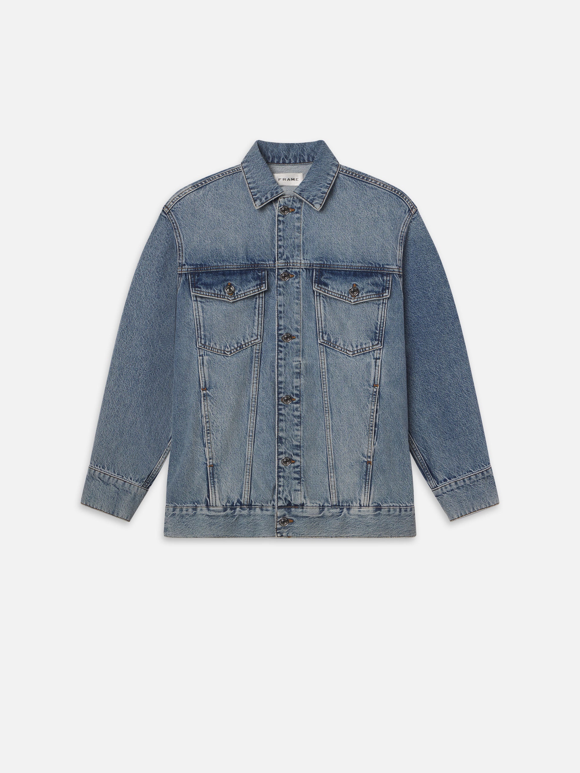The classic trucker jacket is updated this season in an oversized silhoutte for an edgier take on the traditional style. Crafted from a 100% regenerative cotton rigid denim. Materials & Care Dry Clean Only 100% Regenerative Cotton 29.75" Long From Shoulder WP25DJA001-SEAT