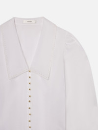 Our best-selling blouse with a summer twist. The short-sleeved top is crafted from 100% cotton, done in white eyelet with an oversized collar that falls into an alluring V-neckline. Featuring feminine pleated sleeves for a romantic silhouette. Materials & Care Dry Clean Only 100% Cotton 22.375" Long From Shoulder WE25WBL027-WHT