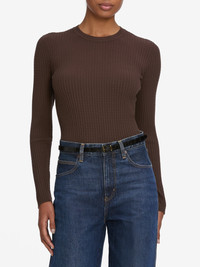 This lightweight, stretchy knit features delicate cable detailing and a slim-fitting, figure-flattering shape. Gorgeous on its own or layered beneath jackets and coats. Materials & Care Dry Clean Only 77% Viscose/23% Polyester 20.5" Long From Shoulder WF25KSW014-CFFE