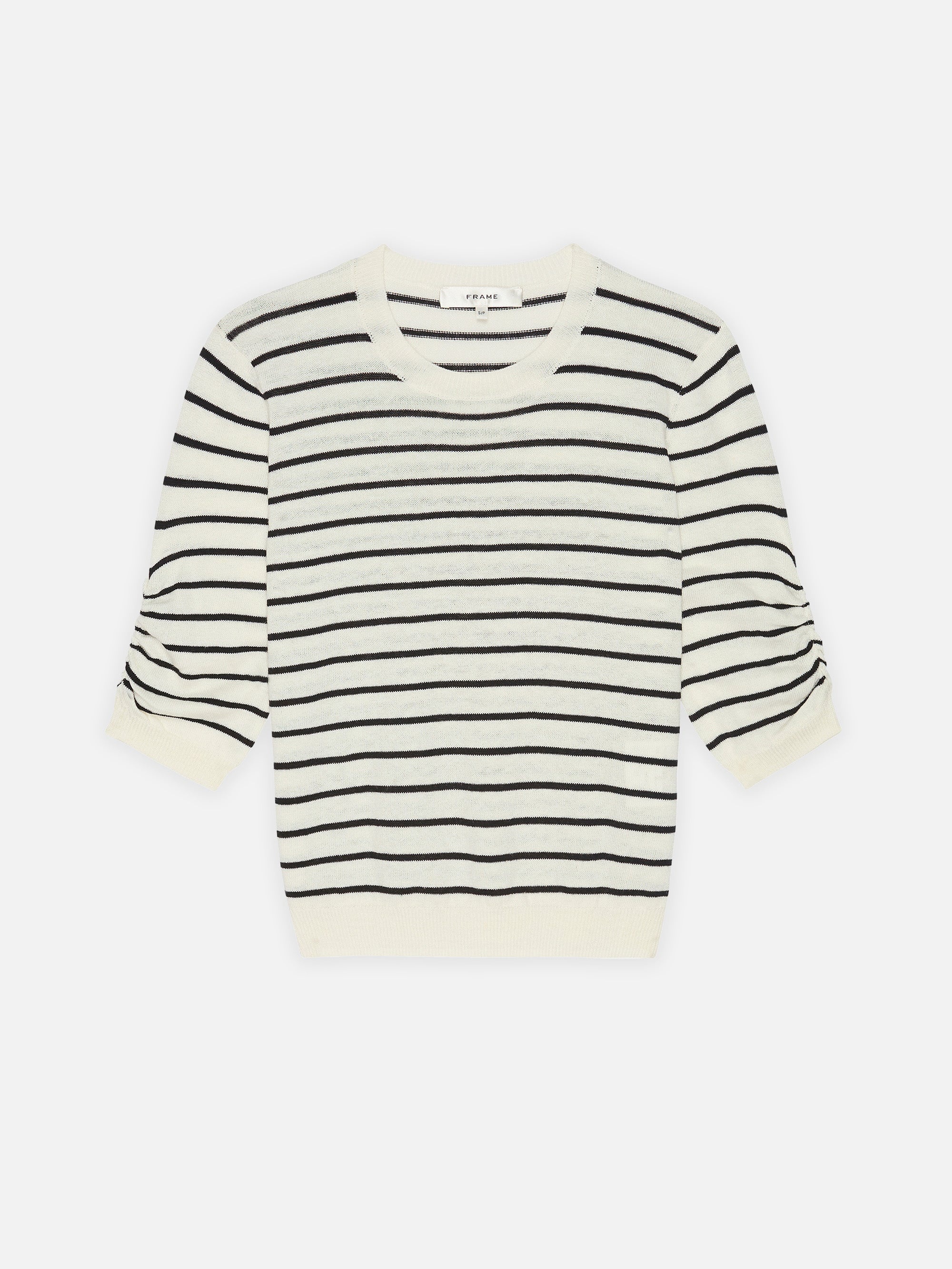 Please note: This is a sale style. A $12 restocking fee applies for any return that includes Sale styles, deducted from the refund total. The Gathered Sweater is artfully gathered to subtly enhance the figure. Note the subtle puff sleeves with soft pleating that infuse this sweater with a feminine feeling, finished with a classic striped pattern. Materials & Care Machine Wash Cold 35% Cotton/35% Lyocell/30% Linen 20" Long From Shoulder WS25KSW040-CREM