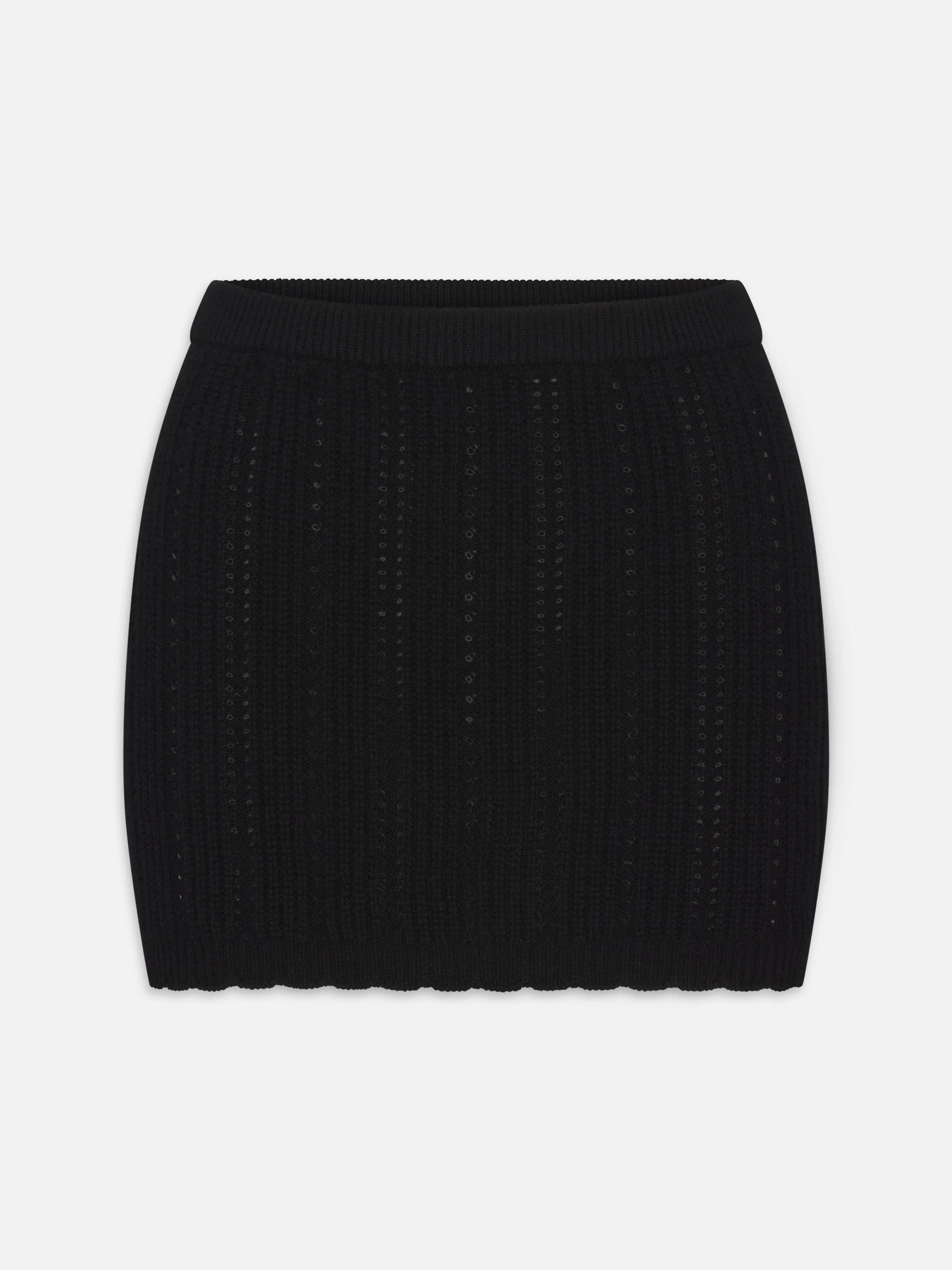 A sleek cashmere mini skirt with a smooth elasticated waistband and open knit. Pair with the Getaway Top for a romantic knitwear set. DETAILS - Dry Clean Only - 100% Cashmere - 12.25" Long From Waist - WP26KSK002-BLK