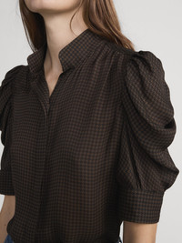 At once modern and feminine, this silk blouse has become a FRAME favorite. Featuring a high neckline and subtle puffed sleeves with ruched detailing, it easily complements any of your denim. DETAILS - Dry Clean Only - 100% Silk - 25" Long From Shoulder - WP26WBL004-AMCM