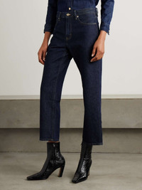 EDITORS'NOTES FRAME’s ‘The Hang’ jeans are cut from rigid denim that’s made from regenerative cotton and will soften over time. Designed for a high-rise fit, they have straight legs traced with yellow topstitching that contrasts the dark ‘Rinse’ wash. Lower-Impact Materials. This product is made using at least 50% lower-impact materials or ingredients. Find out more about our NET SUSTAIN criteria here. SIZE & FIT Model measurements: - Fits true to size, take your normal size - High-rise, cut for a straight-leg fit - Mid-weight, non-stretchy fabric - Size 26 jeans have an inside leg of 28"/ 70cm - Model is 180cm/ 5'11" and is wearing a size 26 - Bust: 76cm/ 30" - Waist: 64cm/ 25" - Hip: 86cm/ 34" DETAILS & CARE - Indigo denim - Button and concealed zip fastening at front - 100% regenerative cotton - Machine wash - Designer wash: Rinse - This product has been made with regenerative cotton, supporting holistic farming practices that increase soil health, improve biodiversity and reduce carbon emission