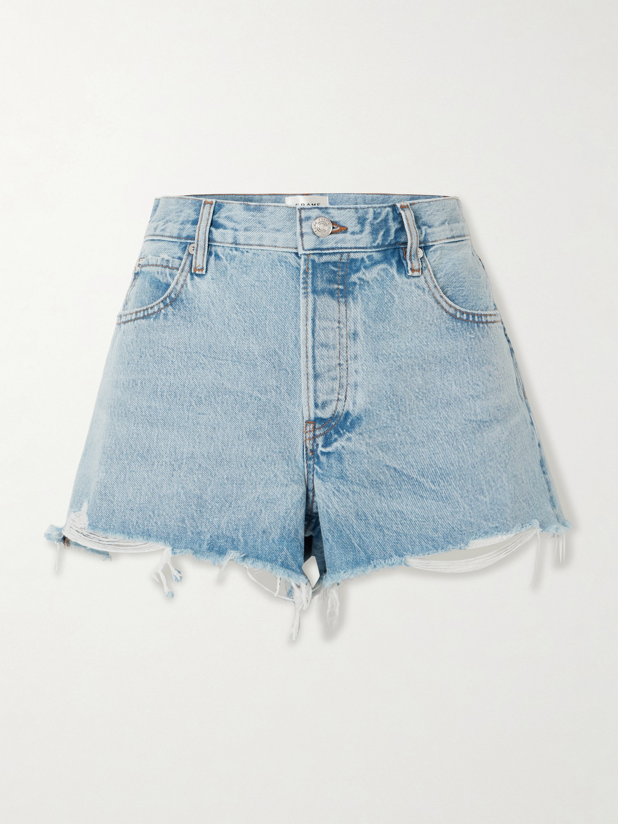 FRAME's 'The Hang' shorts are cut from denim with a high waist and roomy legs with frayed hems for a well-worn feel. Wear yours with a ribbed tank and sneakers. Lower-Impact Materials. This product is made using at least 50% lower-impact materials or ingredients. Find out more about our NET SUSTAIN criteria here.