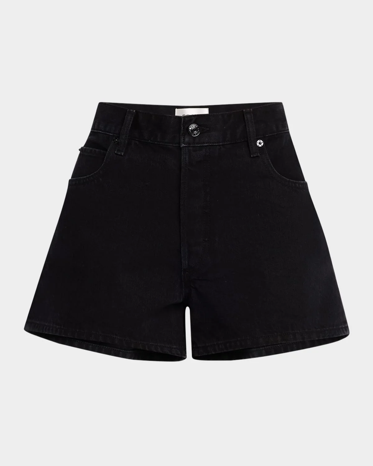 - FRAME "The Hang Shorts" in black denim - Mid-rise; sits high on the hip - Five-pocket style - Relaxed fit - Button/zip fly; belt loops - Cotton - Machine wash cold - Imported