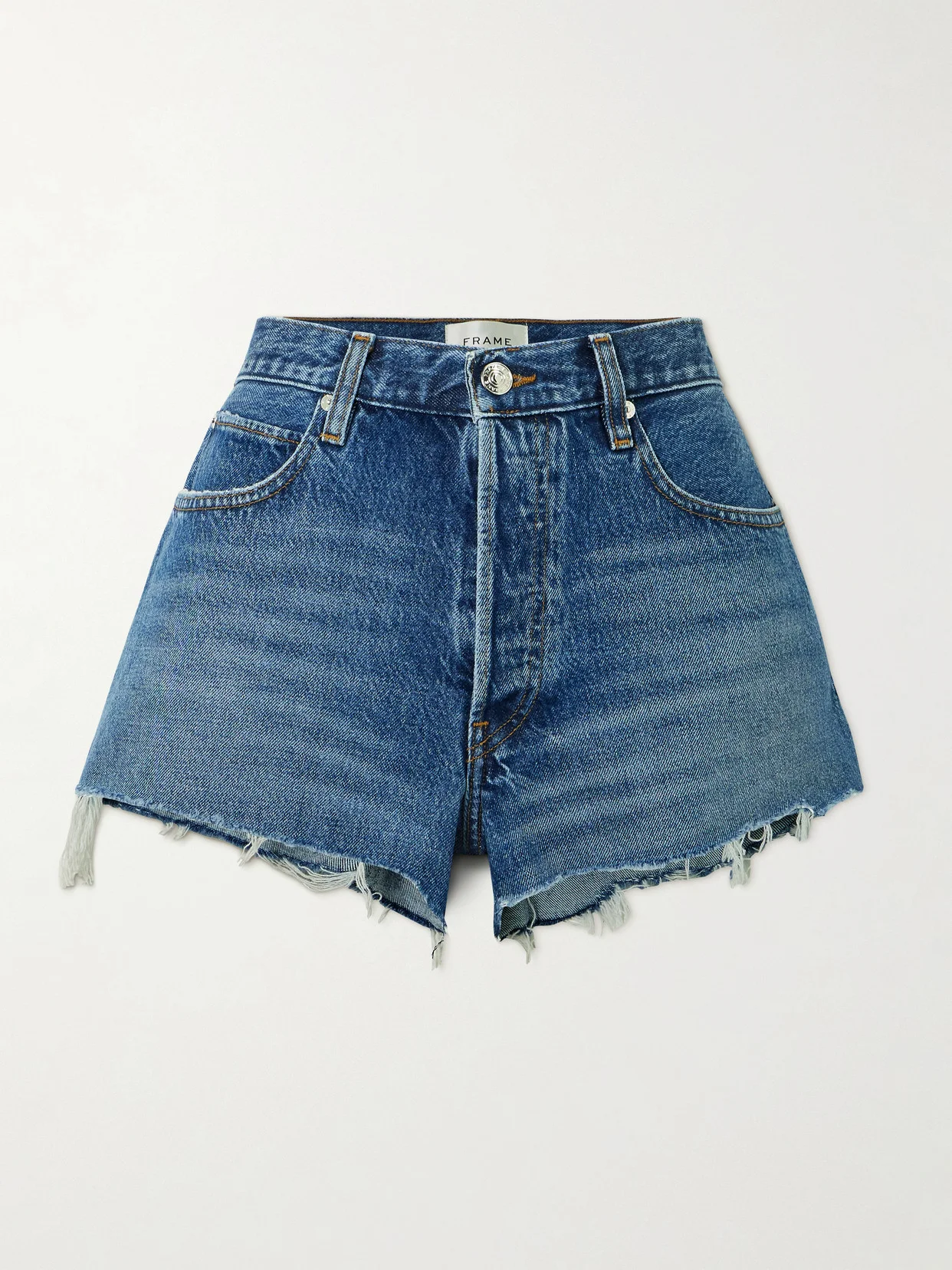 FRAME's 'The Hang' shorts are cut from denim with a high waist and roomy legs with frayed hems for a well-worn feel. Wear yours with a ribbed tank and sneakers. Lower-Impact Materials. This product is made using at least 50% lower-impact materials or ingredients. Find out more about our NET SUSTAIN criteria here.