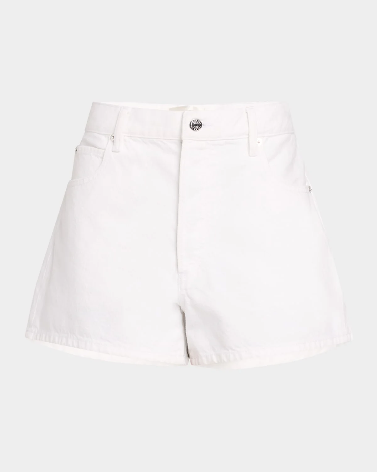 - FRAME "The Hang Shorts" in white denim - Mid-rise; sits high on the hip - Five-pocket style - Relaxed fit - Button/zip fly; belt loops - Cotton - Machine wash cold - Imported