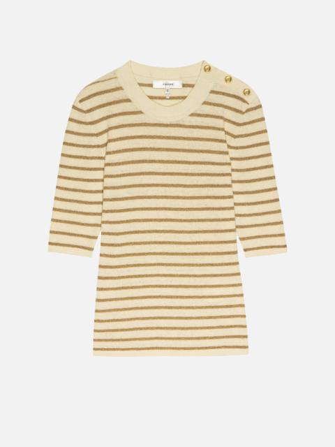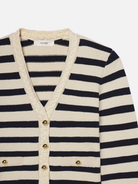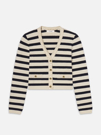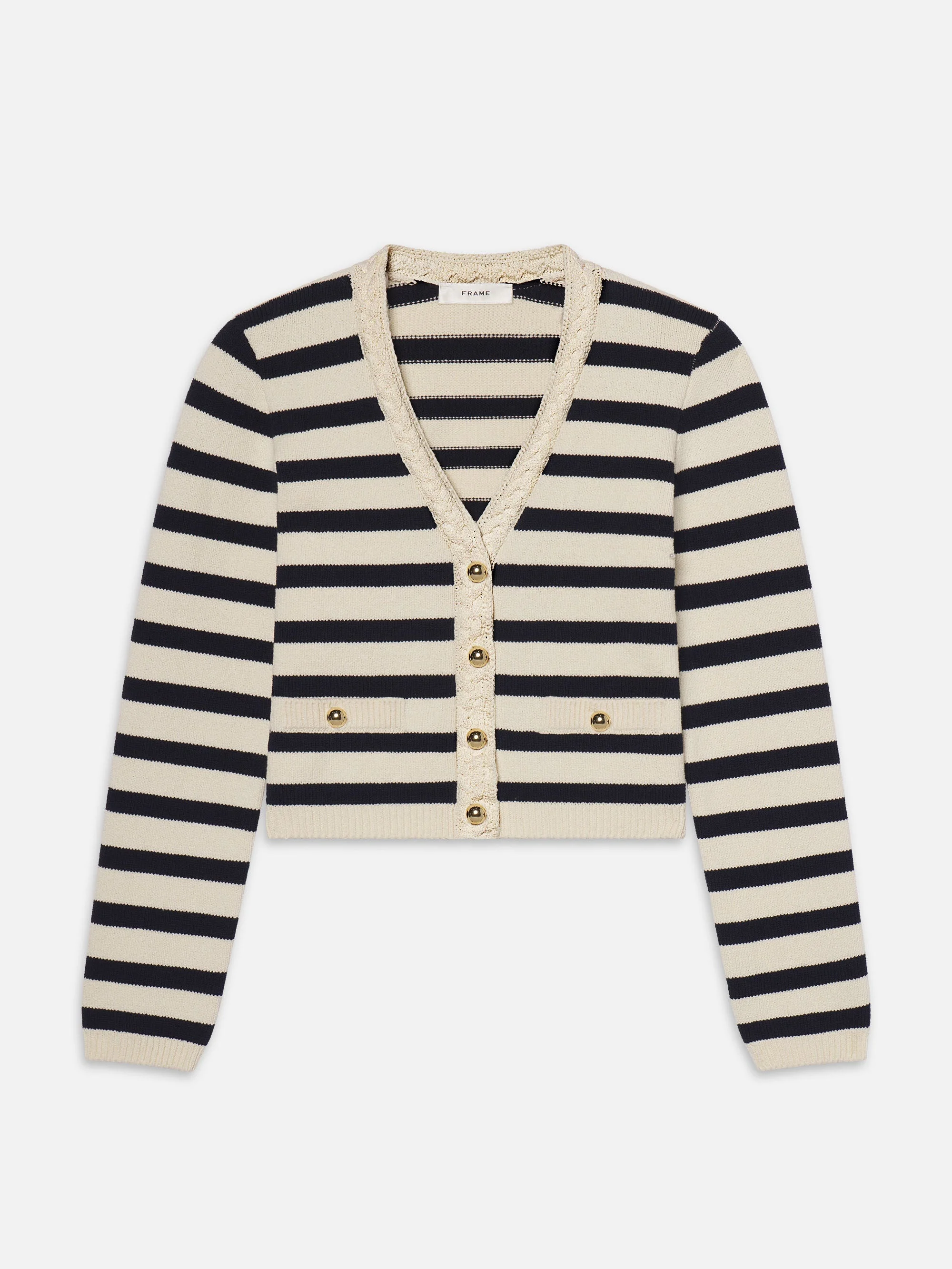 The Harbor Cardigan pairs braided trim and gold buttons with classic navy-and-cream stripes. Slightly cropped at the natural waist, this V-neck knit steers nautical in a new direction—anchored in tradition, finished with charm. Materials & Care Dry Clean Only 75% Cotton/25% Polyamide 18.5" Long From Shoulder WE25KSW014-NAMU