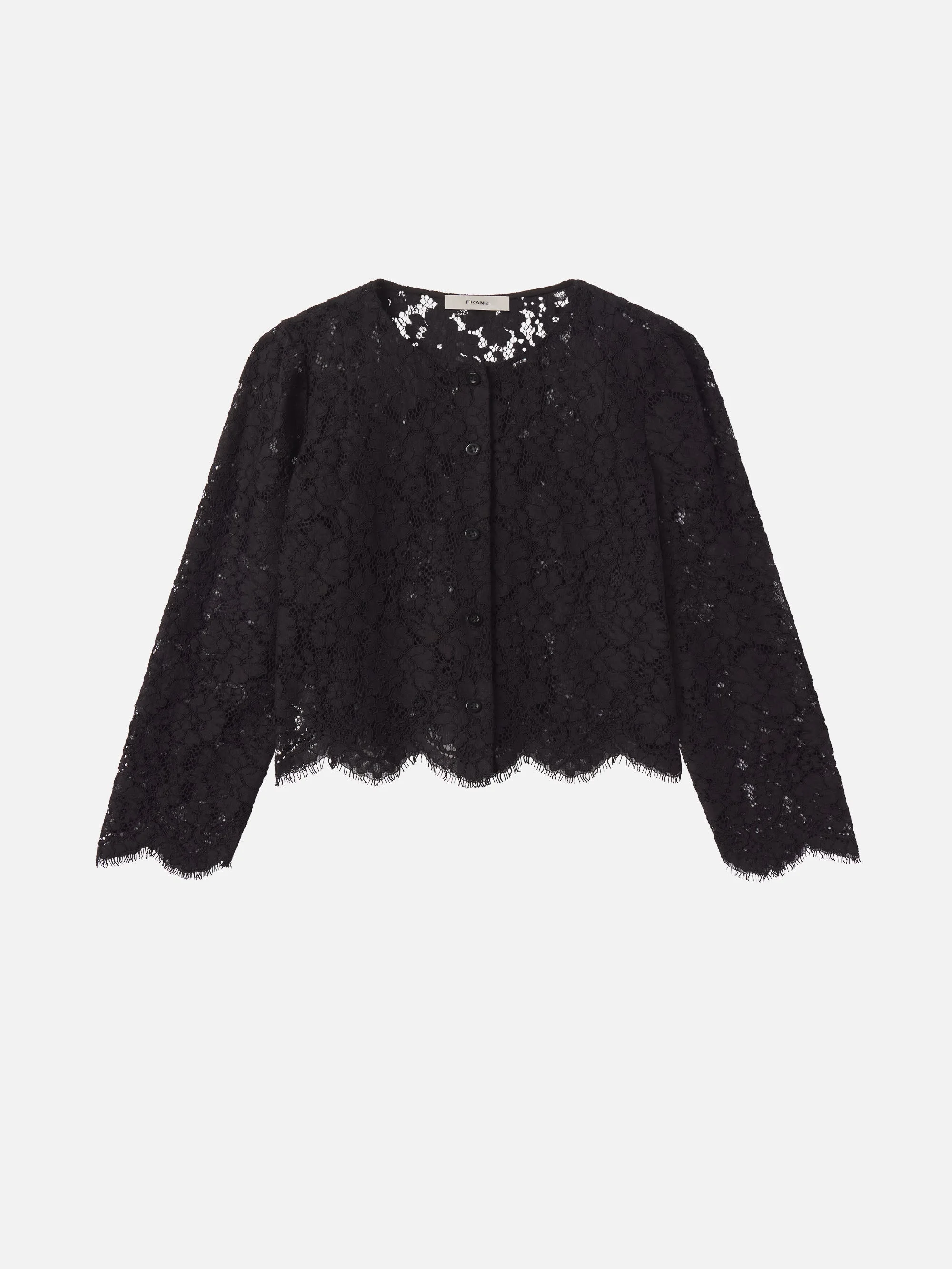 This effortlessly polished blouse is crafted in heavy lace for a modern, structured silhouette, and finished with femme scalloped edges. Waistband-grazing, with full-length sleeves and subtle button closures. DETAILS - Hand Wash Cold - 54% Organic Cotton, 23.8% Recycled Poly, 16.2%Viscose, 3.9%Cotton 2.1%Polyamide - 20" Long From Shoulder - WP26WBL009-BLK