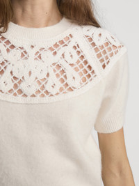 The Lace Gathered Sweater is crafted from brushed cashmere with delicate lace detailing at the collar and gathered cap sleeves, blending soft texture with feminine sophistication. DETAILS - Dry Clean Only - 100% Cashmere - 20" Long From Shoulder - WP26KSW024-CREA