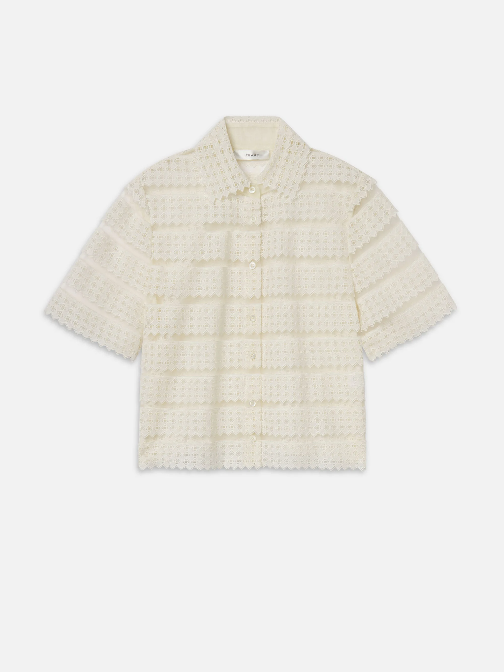 A short-sleeve blouse in sheer lattice crochet. Designed with a collar, button-front closure, and scalloped edges throughout. Lightweight with a straight fit. DETAILS - Dry Clean Only - 100% Nylon - 20" Long From Shoulder - The model is wearing a size small and is 5”8 in height. - WS26WBL021-CREA