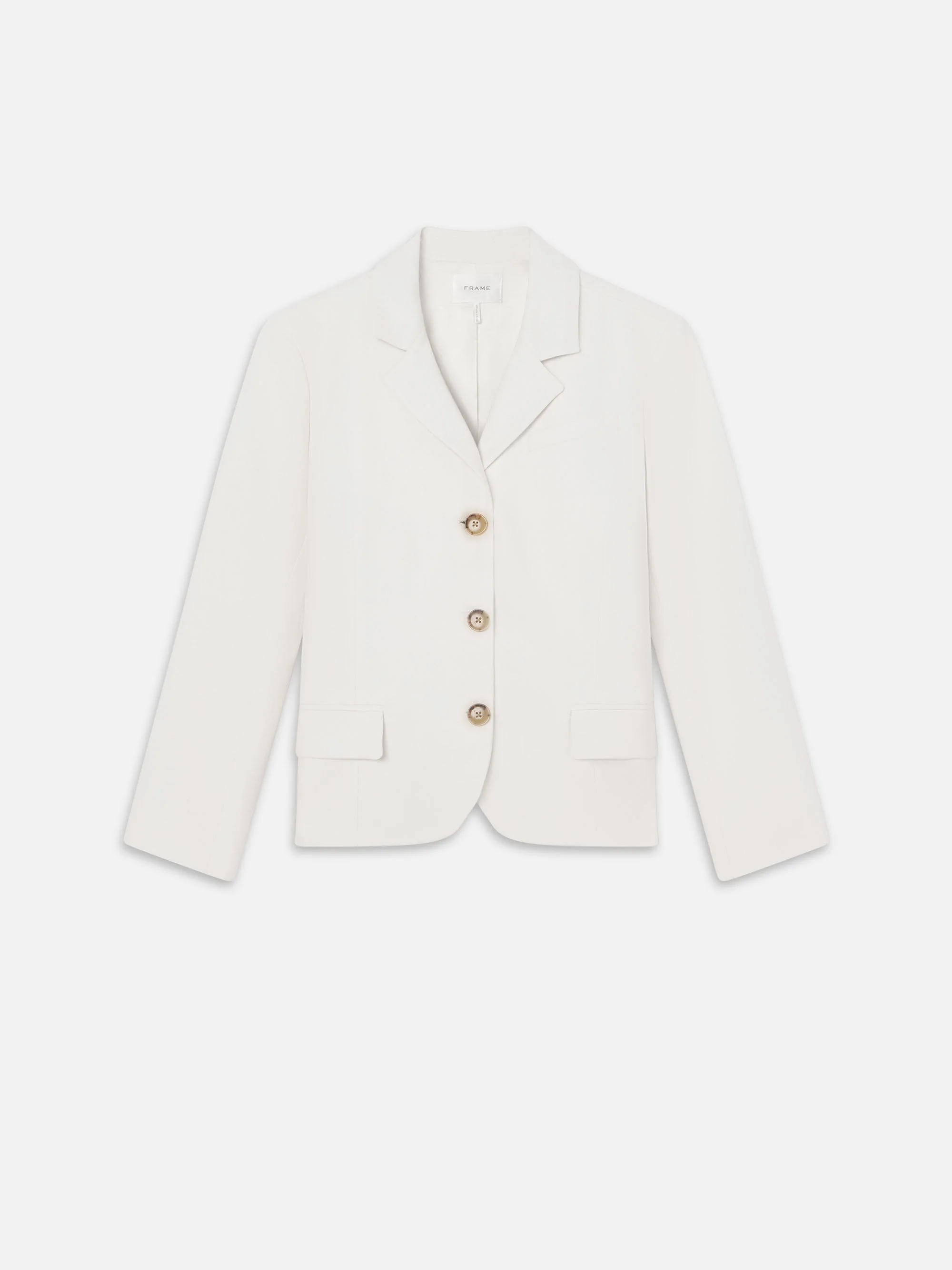 A fresh take on tailored. Cut from a soft linen-viscose blend, this blazer features notched lapels, button closures, and flap pockets—structured enough for dressed-up days, light enough for late summer air. Pair yours with The Linen Trouser for a head-to-toe set. Materials & Care Dry Clean Only 70% Linen/20% Viscose 24" Long From Shoulder WE25WBZ003-WHT