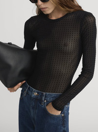 A FRAME team favorite from our latest collection, this sheer, form-fitting top features all-over matte polka dots. Polished with a playful side, The Mesh Polka Dot top makes the perfect layering piece. DETAILS - Hand Wash Cold - 94% Nylon 4% Spandex - 22.75" Long From Shoulder - WP26JTE001-BLK