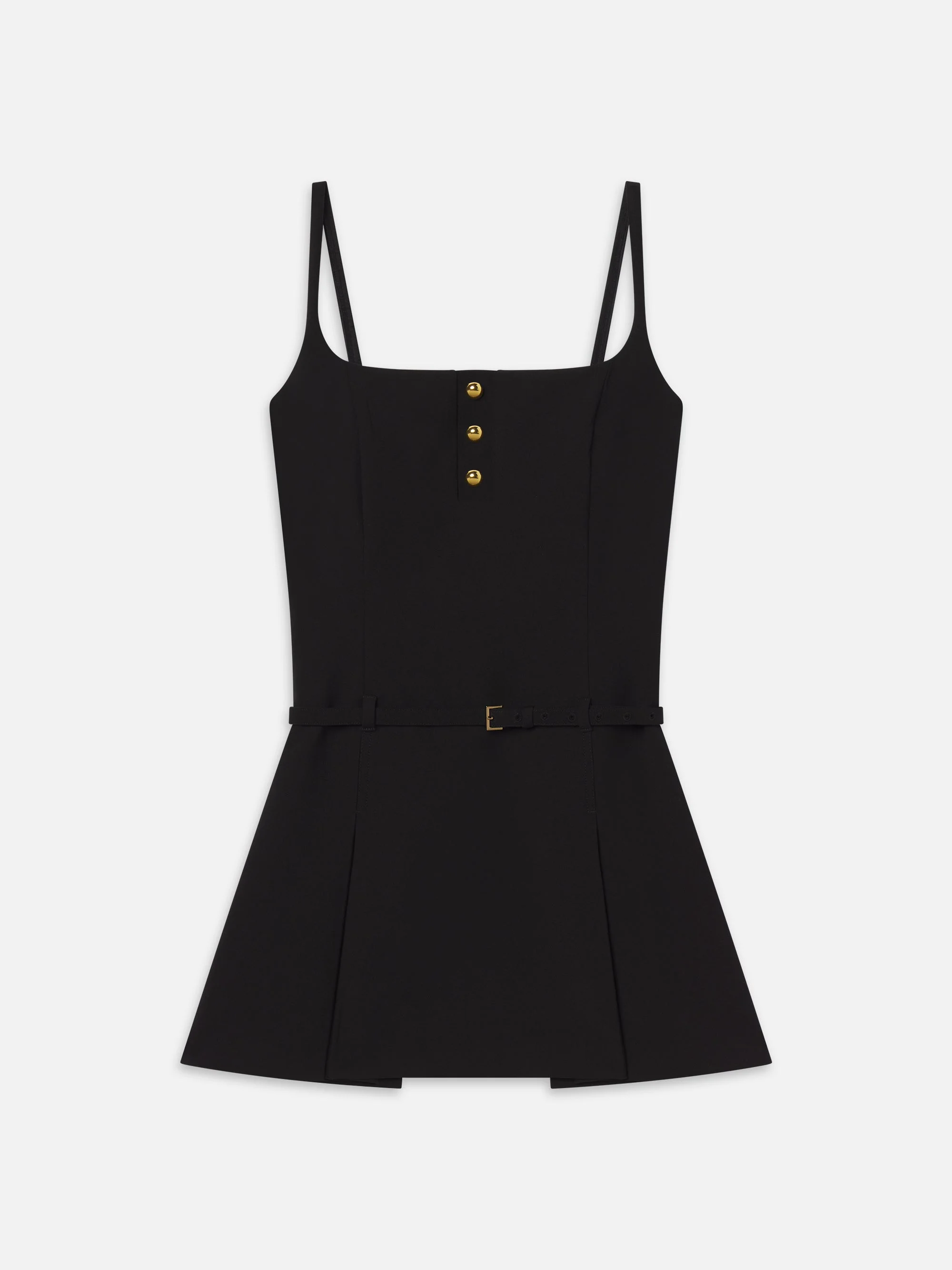 A uniform-inspired black pinafore with gold dome buttons, a self belt, and adjustable straps. Pleated skirt and princess seams add structure. Perfect over a slim turtleneck—expect compliments. Materials & Care Dry Clean Only 63% Viscose/29% Polamide/8% Elastane 31" Long From Shoulder WF25WDR008-BLK
