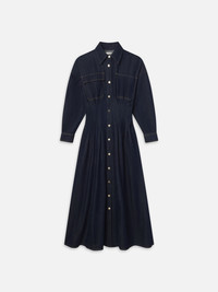 This maxi dress takes denim tailoring to new heights with carefully-placed pintucks through the bodice. The result is an effortless hourglass silhouette reinforced by rigid denim, asymmetric pockets, and a cleverly concealed zipper through the waist to prevent gaping. Materials & Care Dry Clean Only 30% Lyocell/28% Organic Cotton/21% Pre Consumer Recycled Cotton/21% Post Consumer Recycled Cotton 53.375" Long From Shoulder WP25DDR004-RINS