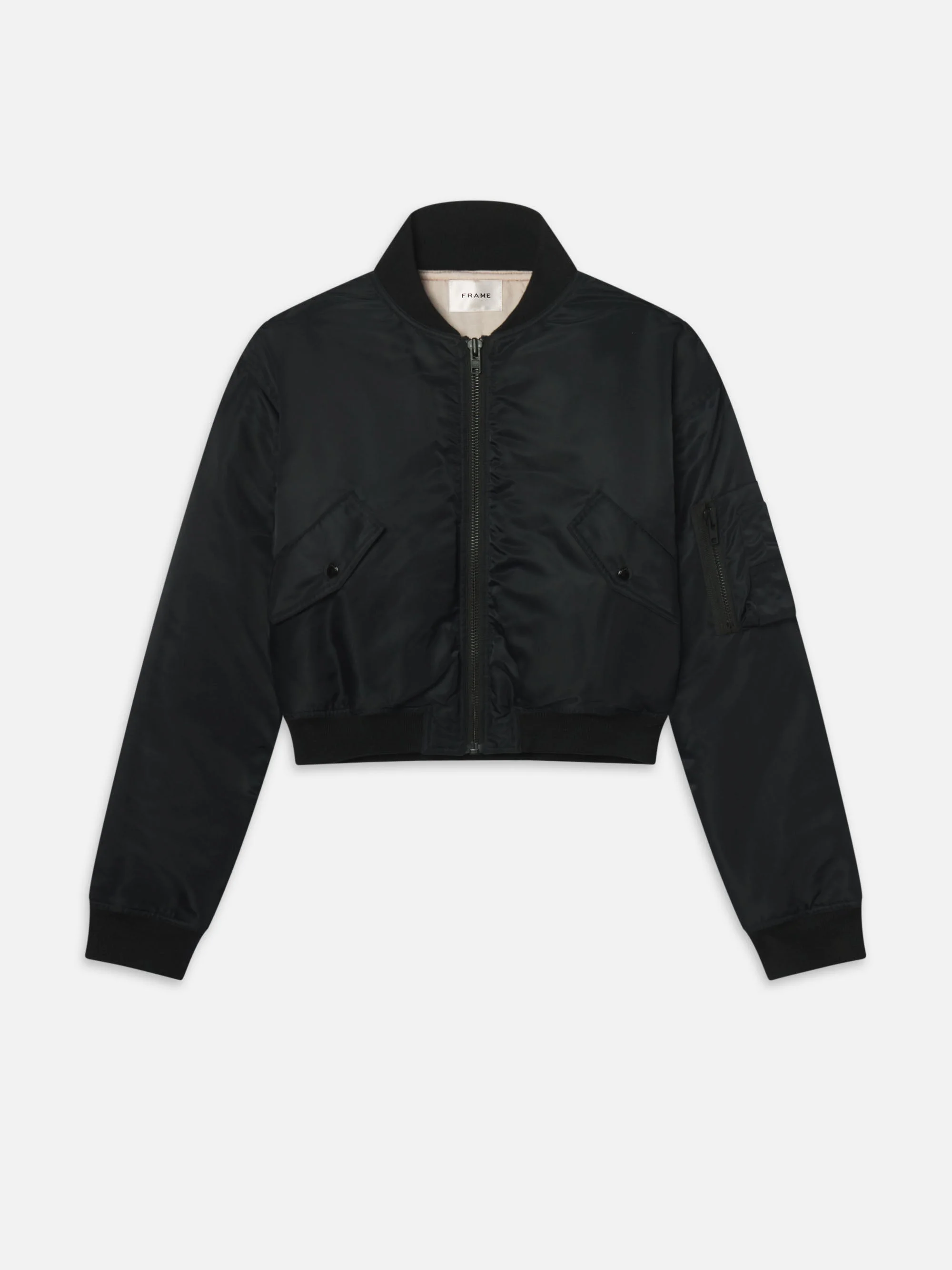 A modern take on the timeless bomber silhouette. This jacket has a slightly cropped fit, double front flap pocket and a zip pocket at the sleeve—finished with ribbed trim for a fitted waist, with contrast lining for quiet tonal depth. Materials & Care Dry Clean Only 100% Nylon 22" Long From Shoulder WF25WJA003-BLK
