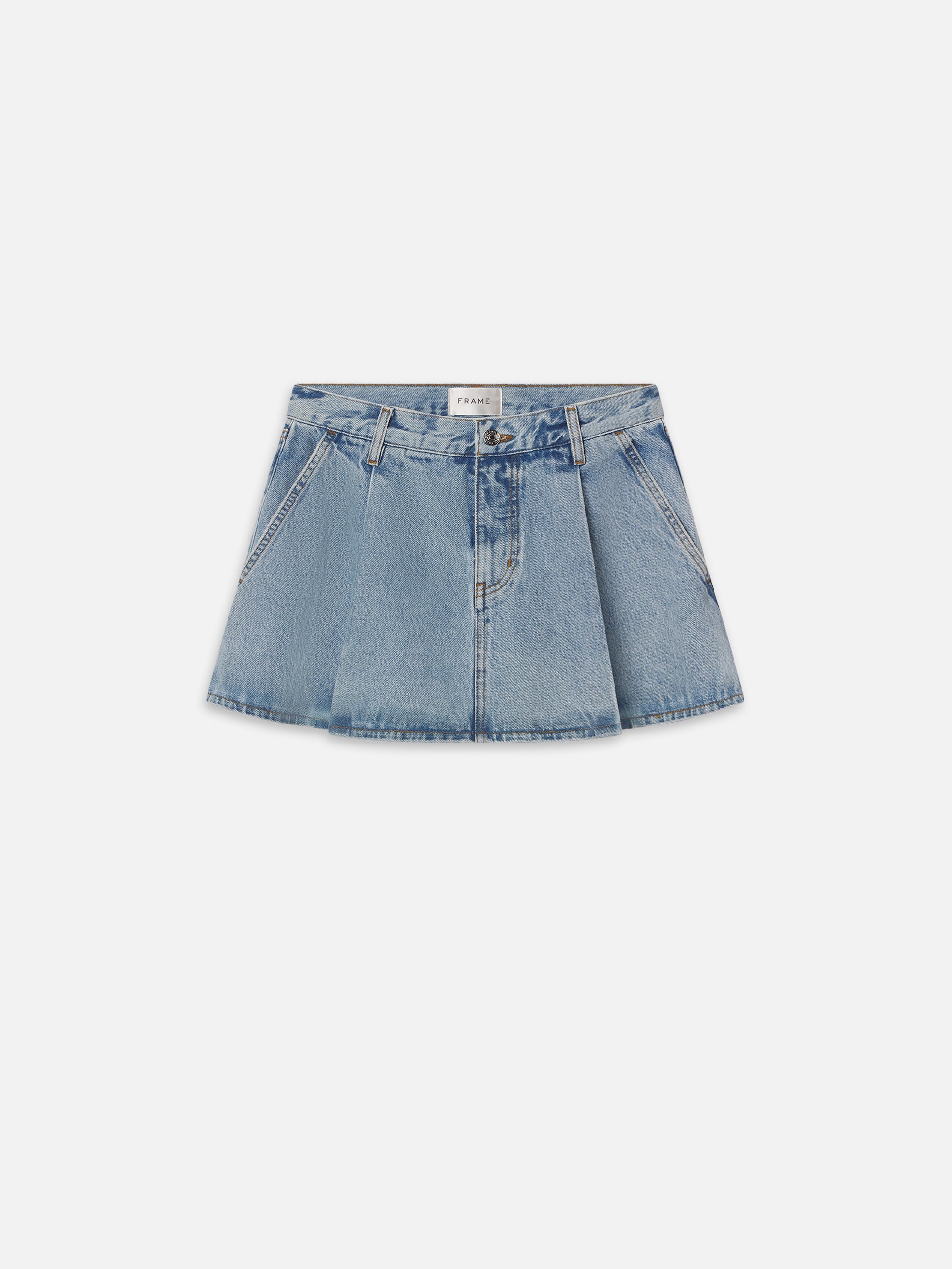 A mid-rise mini skirt crafted from a 100% regenerative cotton rigid denim. The front pleats add unexpected dimension to the classic denim mini and create a flattering flared silhouette. Finished with front side slit pockets and traditional back pockets. Materials & Care Machine Wash Cold 100% Regenerative Cotton 11.5" Long From Waist 005DSK210-OTLW