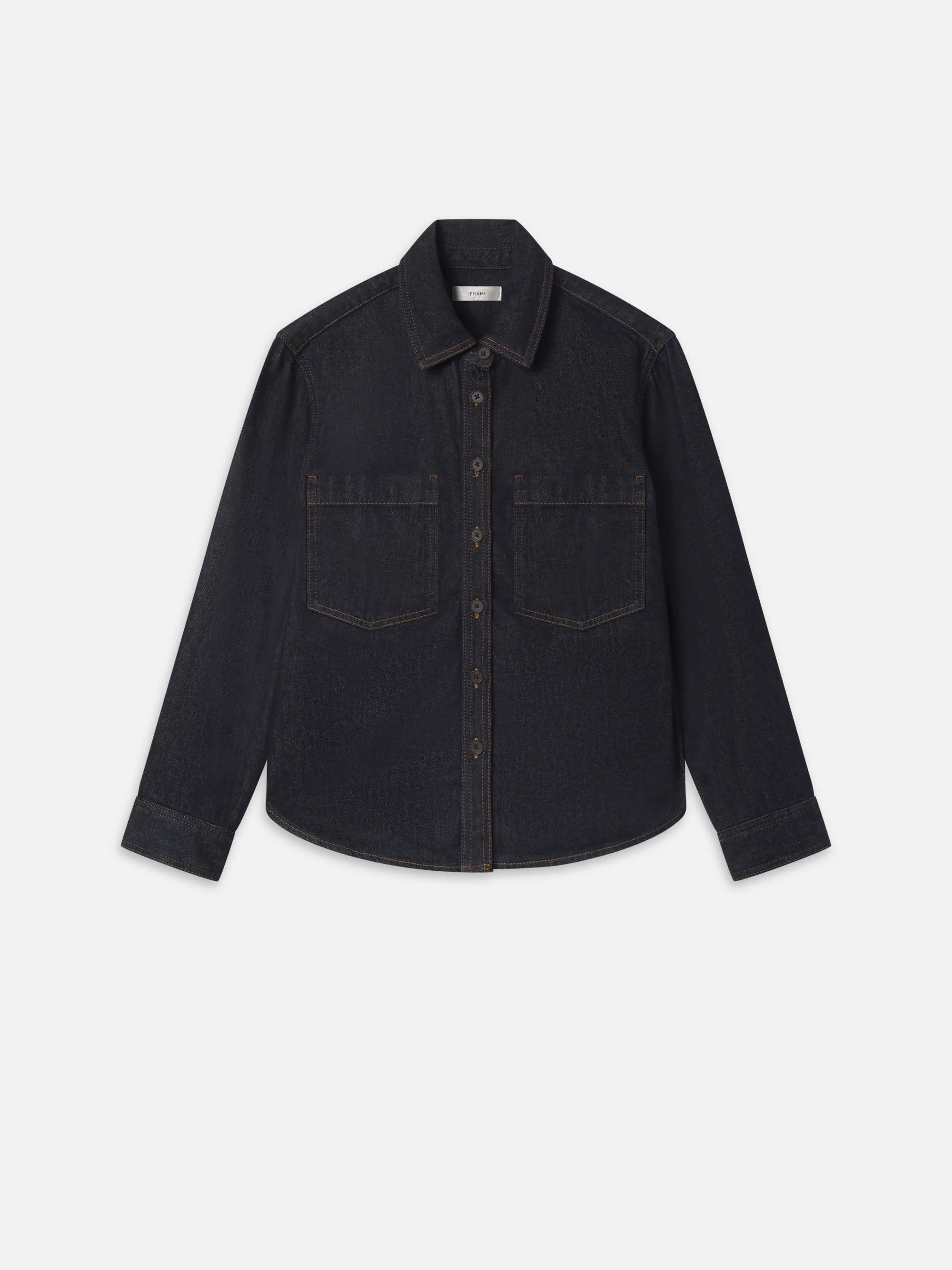 This elevated take on the traditional denim shirt is crafted with oversized front patch pockets, button closures and subtle tonal stitching. DETAILS - Luxury denim made from 100% premium cotton conforms to your figure as it breaks in for a highly personal, incredibly flattering fit. - Machine Wash Cold - 80% Cotton/20% Post Consumer Recycled Cotton - 27.5" Long From Shoulder - 7036216-RINS
