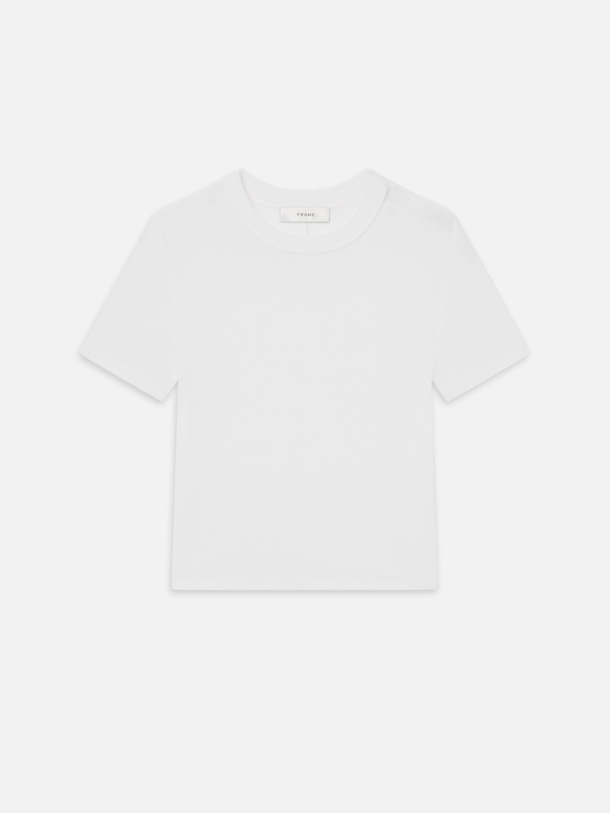 Soft and stretchy, this baby tee enhances your go-to everyday t-shirt with fine ribbed trim. Cut to a slightly shrunken fit, you can pair it with denim for a chic, fuss-free uniform. Materials & Care Hand Wash Cold 96% Modal/4% Spandex 20.75" Long From Shoulder WE24JKT015-WHT