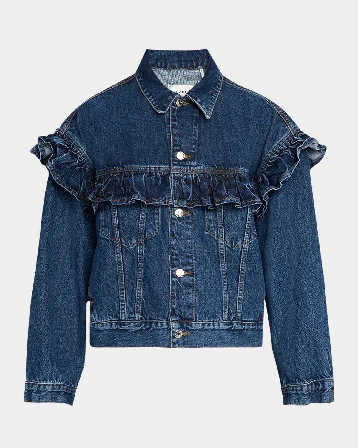 - FRAME "The Ruffle" dark-wash jean jacket updated with fluttering ruffles - Spread collar; button front - Long sleeves; button cuffs - Drop shoulders - Chest pockets; side seam pockets - Straight fit - Cotton - Machine wash cold, wash inside out - Imported
