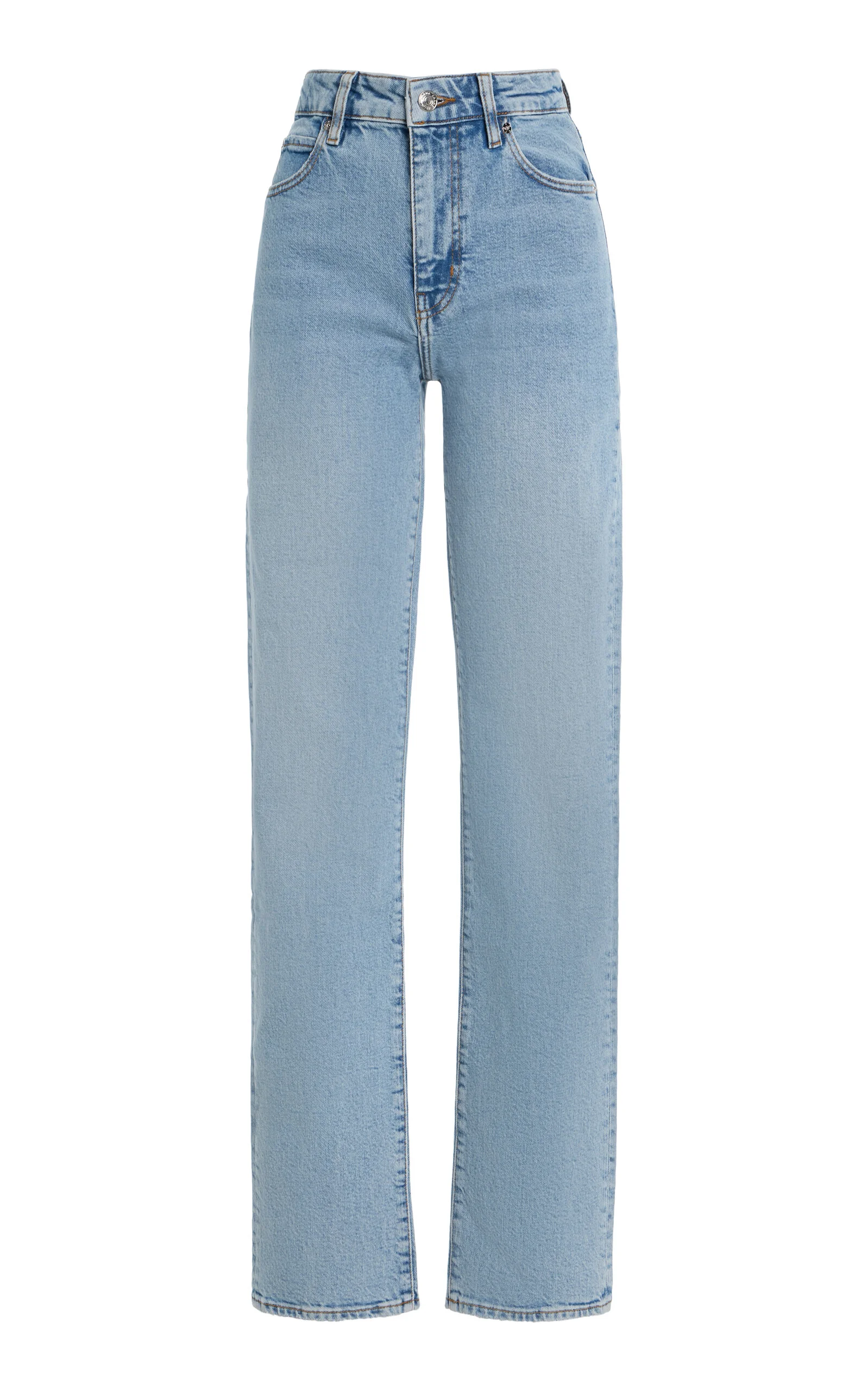 FRAME has distinguished itself in a bustling denim market by concentrating on quality materials and a superb fit that distinguishes even the simplest styles. Aptly named, The Ruler has a full-length inseam for mile-long legs. The high-rise jean is fitted through the hip and thigh and opens to a slim straight-leg silhouette. Despite its tailored, rigid look, it's cut in ultra soft Structured Stretch denim with a hint of stretch, fusing the best of modern wearability and vintage appeal. PRODUCT DETAILS - Pre-Fall '25 - Zip fly fastening - Composition: 79% cotton, 20% pre-consumer recycled cotton, 1% elastane - Designer color: Dolly - Machine wash - Imported SIZE & FIT - Our model is wearing a size 26 - Model is 5’10” with a 30” bust, 24” waist, and 34” hip