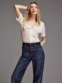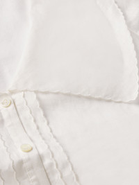 A sleeveless silhouette with a soft sailor collar and delicate V-neckline. Cut from airy ramie, it drapes gently against the body with a natural ease. Pair it with denim or tailoring—think fine, feminine, and endlessly wearable. Materials & Care Machine Wash Cold 100% Ramie 23.5" Long From Shoulder WE25WBL006-WHT