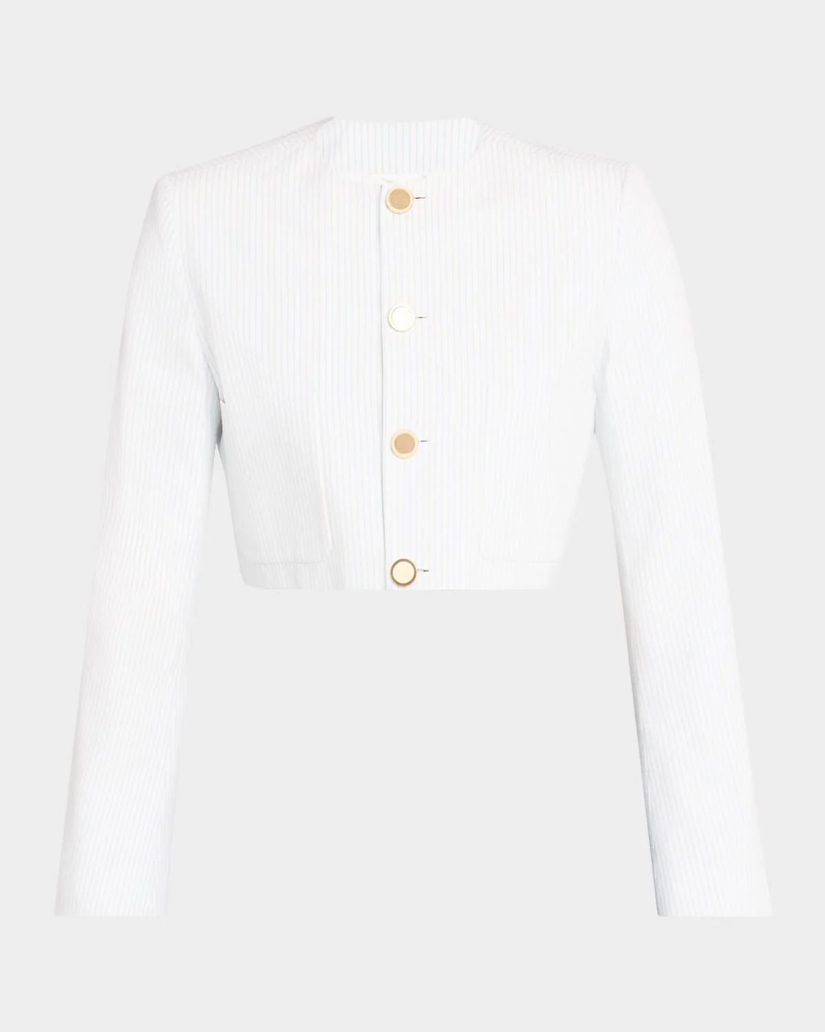 - FRAME "The Seersucker Jacket" finished with gold-tone buttons - Round neckline - Long sleeves - Patch pockets - Cropped fit - Button-front - Modal/cotton/elastane - Dry clean - Imported