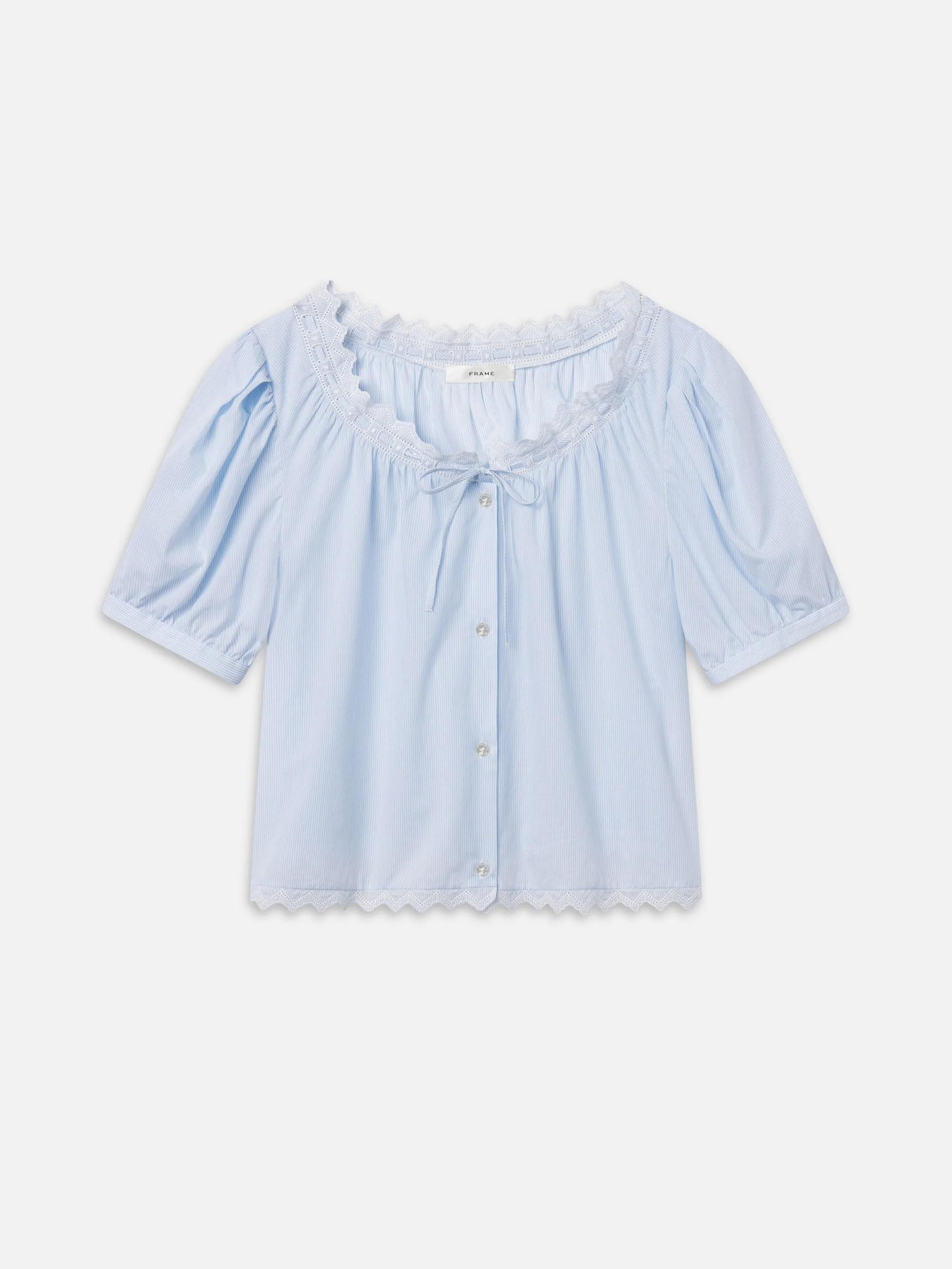 A soft, feminine blouse with easy detail. The Serene Top features delicate trim at the neckline, a button-front closure, and gently puffed short sleeves. Crafted from crisp cotton for an airy, effortless feel. DETAILS - Dry Clean Only - 100% Cotton - 22" Long From Shoulder - The model is wearing a size small and is 5”8 in height. - WS26WBL030-PWBM