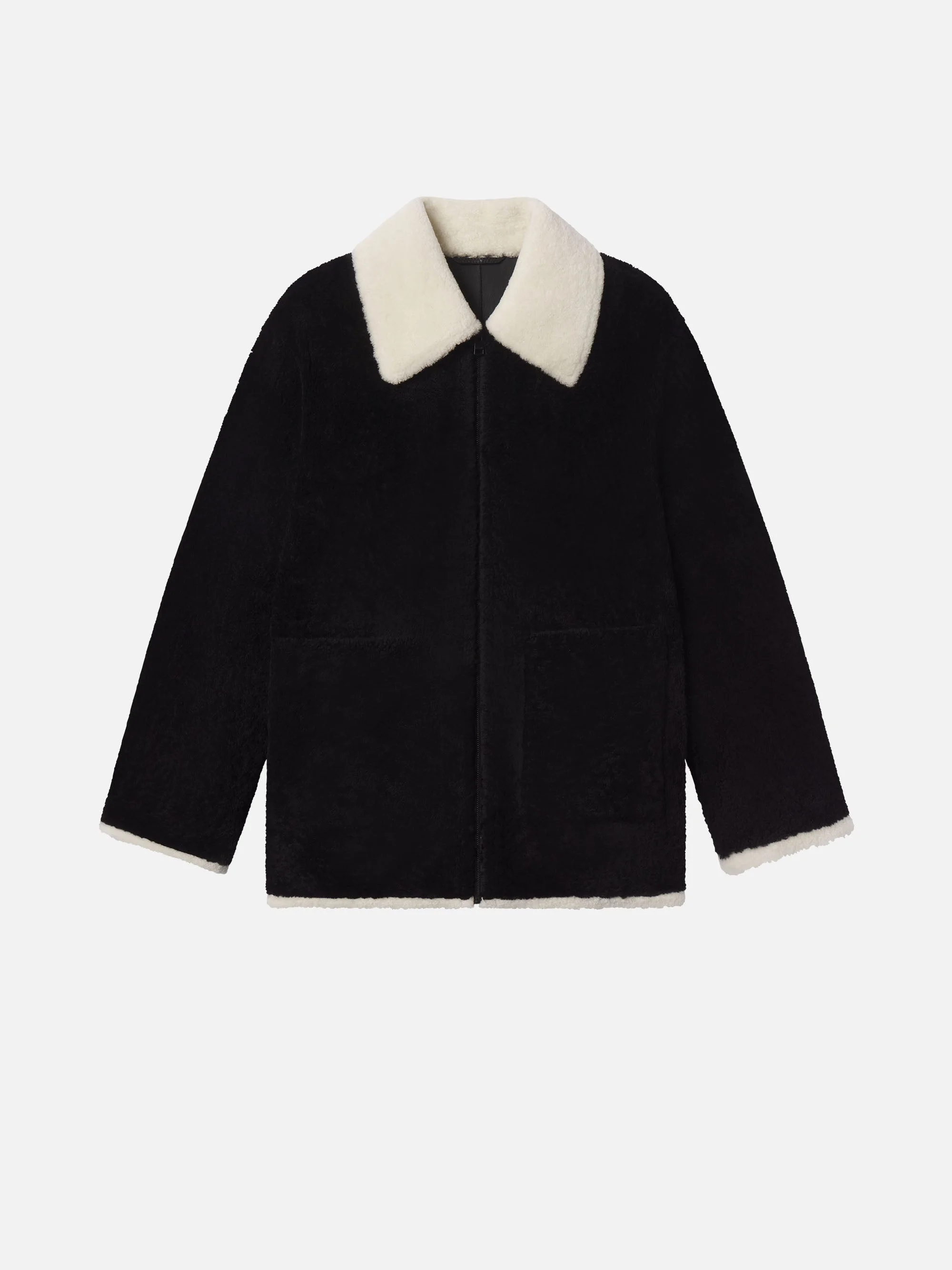 This jacket has a modern, slightly elongated, oversized fit. In black, with white contrast trim in 100% lamb shearling at the cuff, hem and collar. DETAILS - Clean Professionally By A Leather And Suede Specialist - 100% Lamb Shearling - 30.75" Long From Shoulder - WP26LJA012-BLK