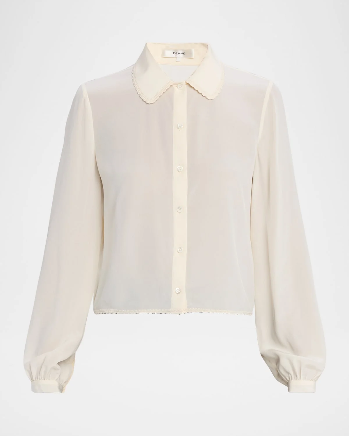 FRAME luxurious silk blouse finished with delicate embroidered trim Peter Pan collar Long sleeves with button cuffs Classic fit Hem sits at the hip Buttonfront Silk Dry clean Imported