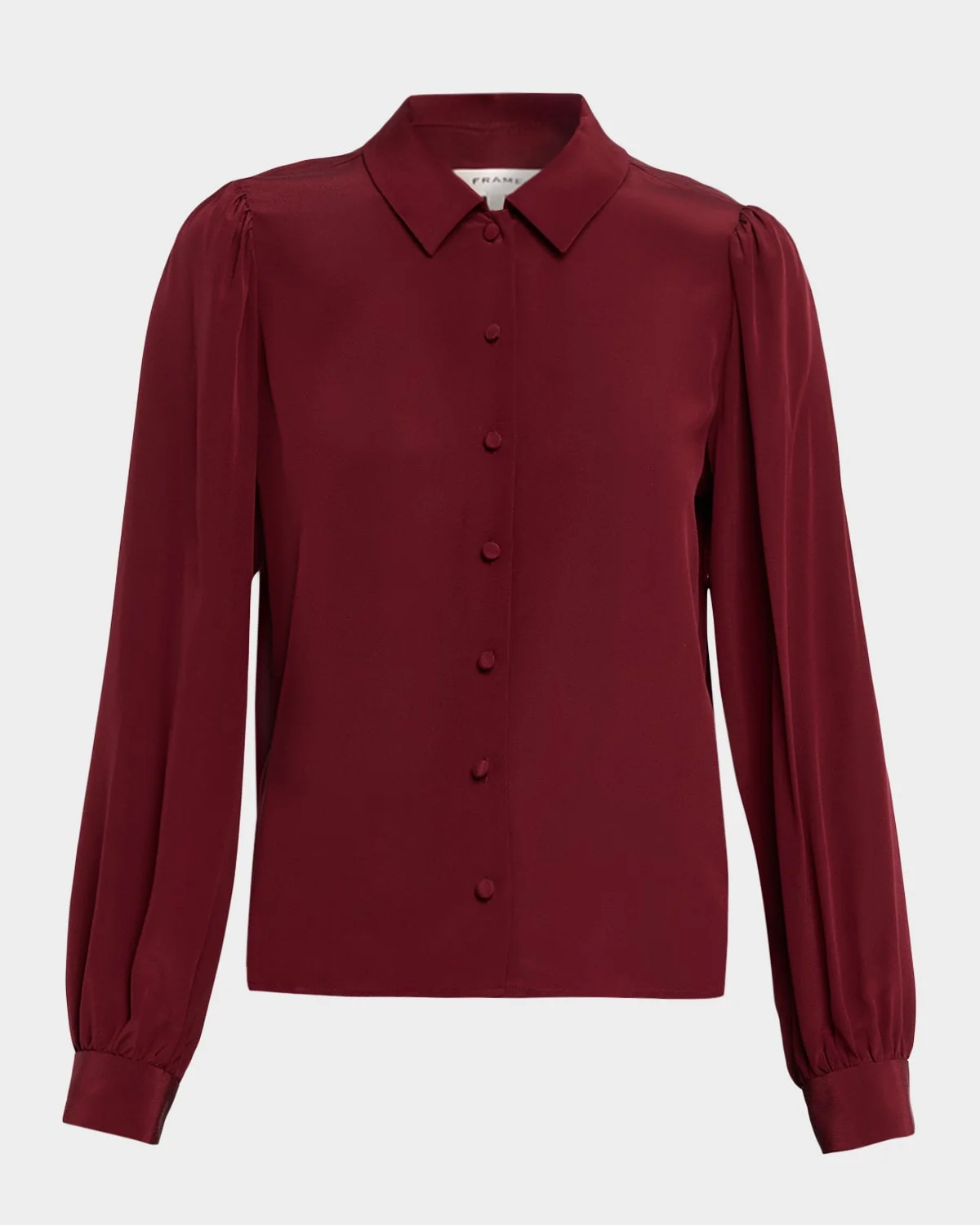 Crafted from luxurious silk, this FRAME blouse is designed in the perfect holiday red hue. Point collar Long puff sleeves with button cuffs Classic fit Hem falls to the hip Buttonfront Silk Dry clean Imported