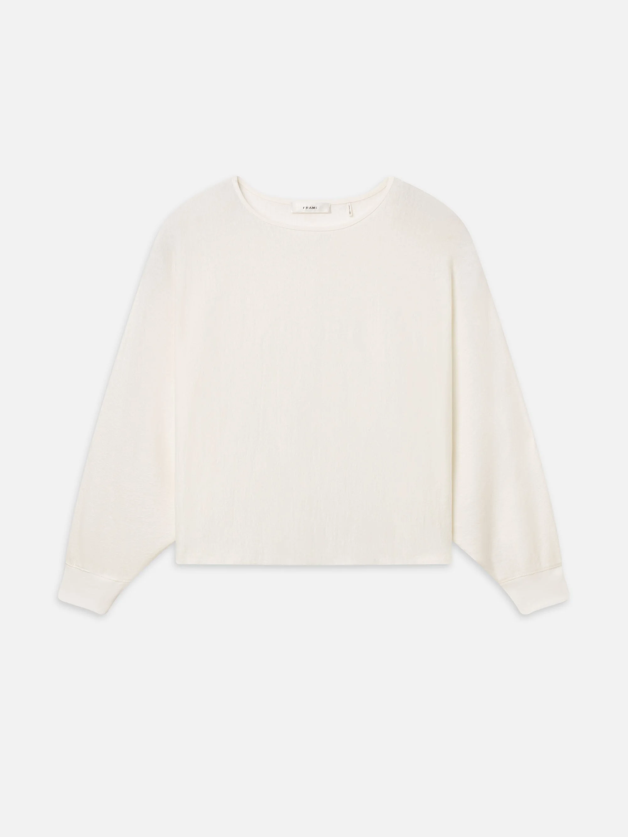 An easy long-sleeve top in lightweight linen. Designed with a wide neckline, relaxed drape, and elongated sleeves with fitted cuffs. Soft, fluid shape. DETAILS - Dry Clean Only - 96% Linen/ 5% Elastane - 22.25" Long From Shoulder - The model is wearing a size small and is 5”8 in height. - WS26JKT019-CREA