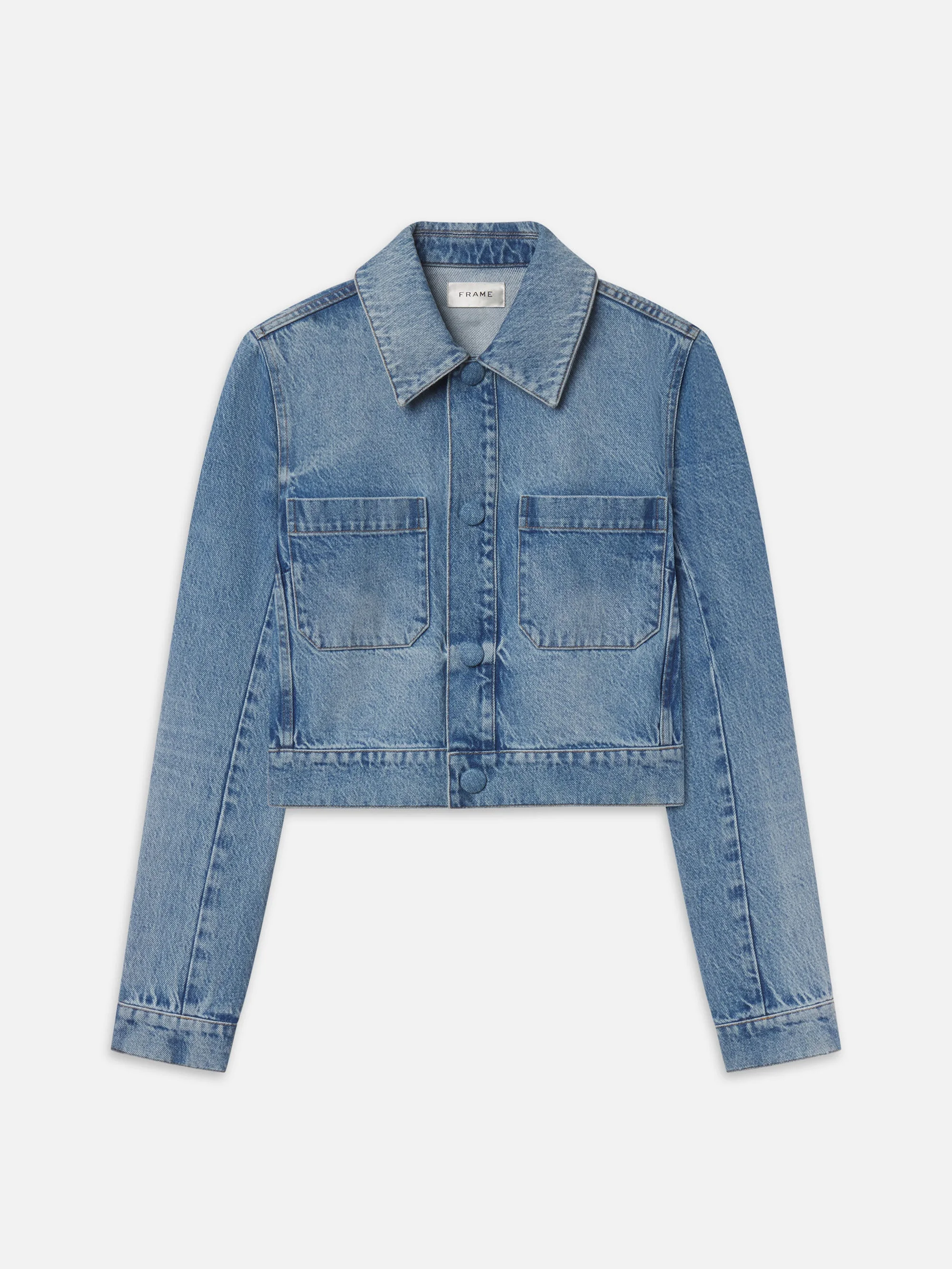 The Small Denim Jacket reimagines our best-selling Small Suede Jacket in crisp 100% cotton denim, featuring a cropped, boxy silhouette and self-covered snap closures along the front for a clean, modern finish. DETAILS - Machine Wash Cold - 100% Cotton - 19.5" Long From Shoulder - WS26WJA008-DAWN