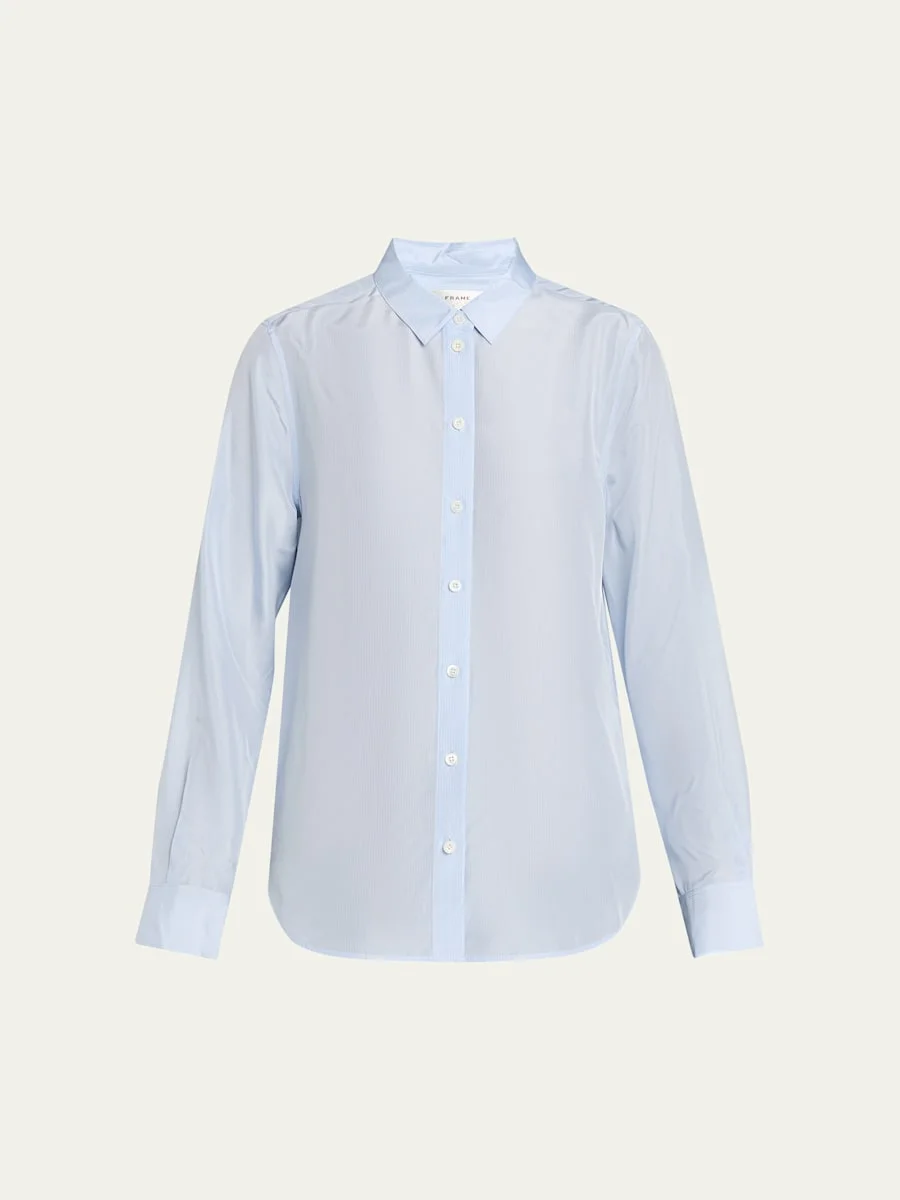 FRAME luxurious silk shirt detailed with a soft, yarndyed stripe Point collar Long sleeves with button cuffs Classic fit Hem falls to the hip Buttonfront Silk Dry clean only Imported SIZE amp; FITModel measurements: 5'10" tall Model is wearing a US size 4/Small