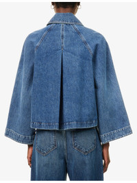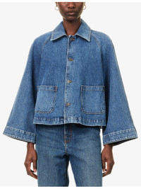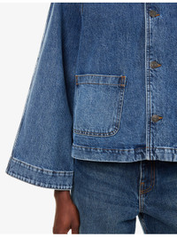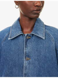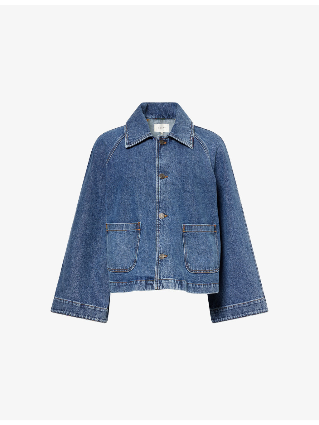 PRODUCT DETAILS - FRAME denim jacket - 100% cotton - Exposed button fastening at front - Relaxed fit, spread collar, raglan long sleeves, two patch pockets at front, pleated at back - Machine wash at 30°C - True to size - Size small: length 22in / 56cm - Model is 5ft 10in/1.78m and wears a size small - Midweight, slight stretch Ref: R04509215