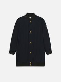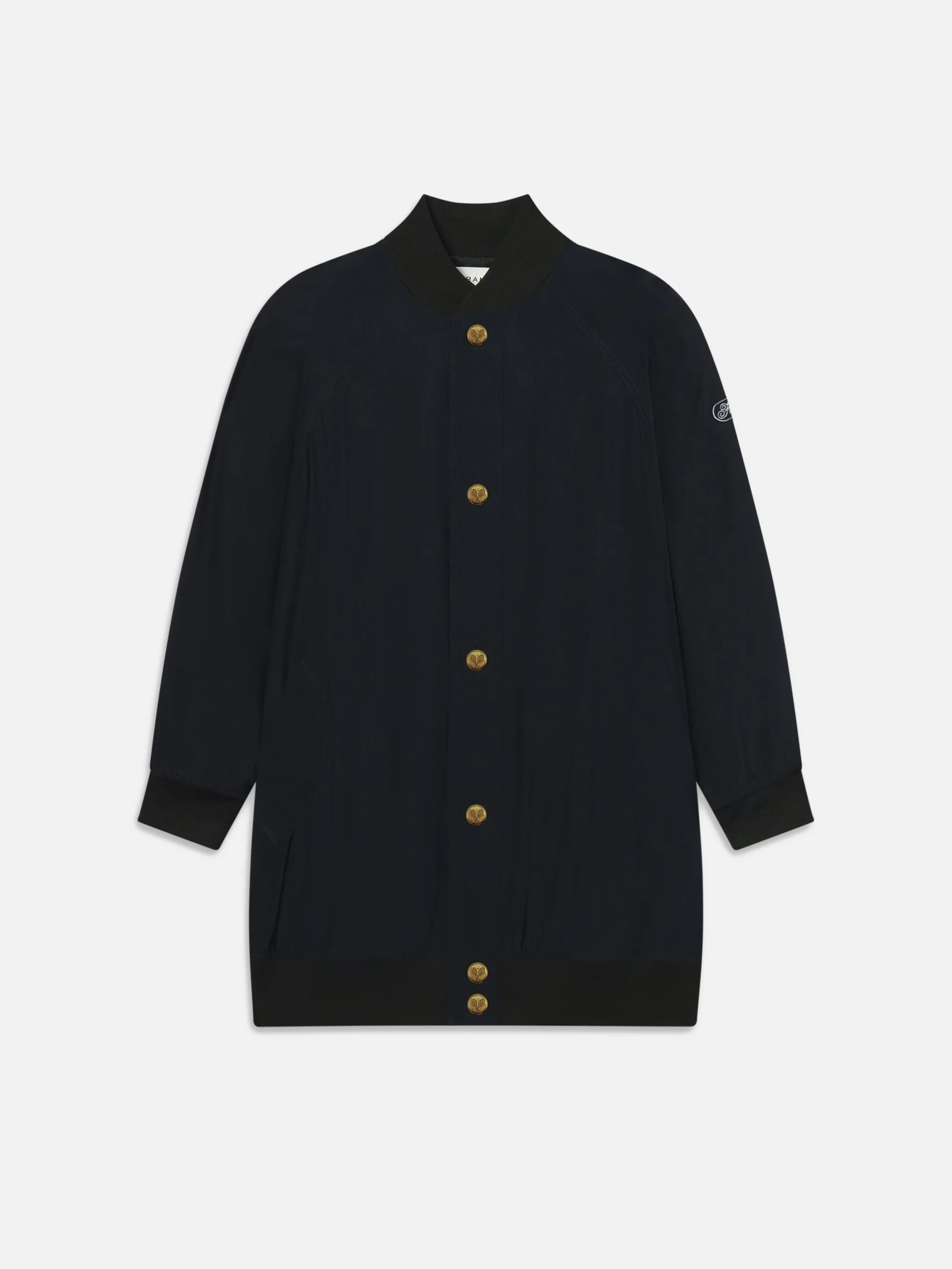 A FRAME favorite from our Tennis Capsule. This unique, hip-grazing bomber is cut from peach-finished silk for a vintage look, with gold buttons featuring tennis rackets and a varsity-inspired FRAME patch. Materials & Care Dry Clean Only 100% Silk 33" Long From Shoulder WF25WJA007-NAVY