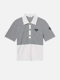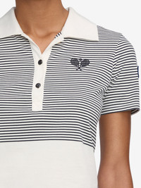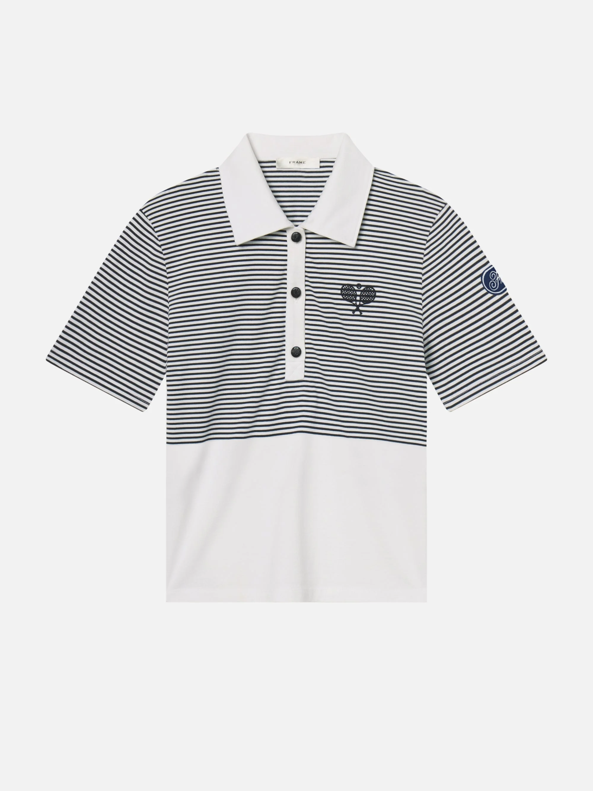 A crisp cotton polo with retro navy and white striping across the chest. Finished with a contrast collar, navy buttons with custom FRAME tennis racket details, and tennis racket embroidery at the chest—a subtle nod to vintage sport. Materials & Care Machine Wash Cold 100% Cotton 20" Long From Shoulder WF25JKT015-WTMU