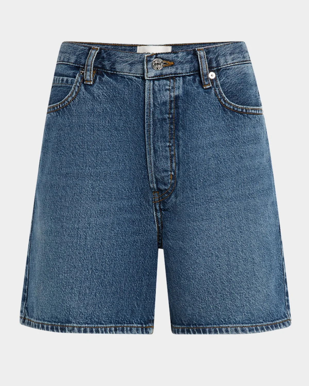 - FRAME "The Timeless" shorts in medium-wash denim - Approx. 6" inseam - High rise - Five-pocket stye - Straight fit - Button/zip fly; belt loops - Cotton - Machine wash cold, inside out - Imported