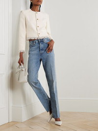 FRAME's jacket channels the elegance of vintage styles with the label's laid-back ease. It's tailored from cotton-blend tweed in a boxy shape with padded shoulders and fringed edges. Wear yours with washed denim and mules. Size & Fit - Fits true to size, take your normal size - Designed for a boxy fit, cut to be worn loose - Cropped length - Mid-weight, non-stretchy fabric - Model is 180cm/ 5'11" and is wearing a size Small Model measurements: - Bust: 80cm/ 31.5" - Waist: 65cm/ 25.5" - Hip: 89cm/ 35" Details & Care - Ivory cotton-blend tweed - Button fastenings through front - 64% cotton, 33% polyester, 3% other fibers; lining: 50% viscose, 50% cotton - Dry clean