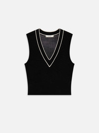Prep, perfected. This open-knit vest features contrast striping and varsity-inspired rib trim, crafted from a breathable cotton-viscose blend. Slim through the body with a clean V neckline, it’s made to layer under the matching cardigan—or wear on its own when the forecast allows. Materials & Care Dry Clean Only 53% Viscose/47% Cotton 20.25" Long From Shoulder WE25KSW024-BKMU