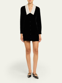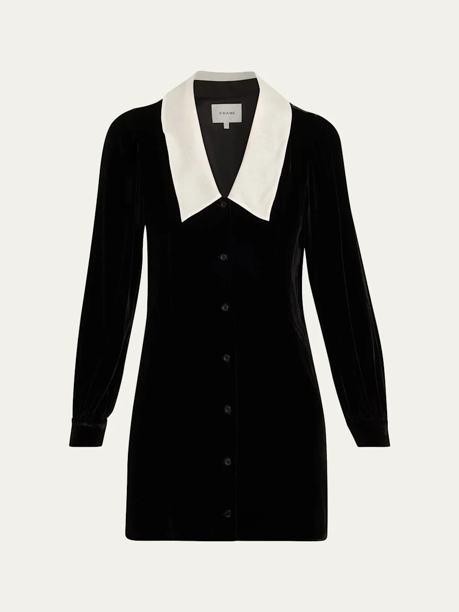 FRAME mini dress crafted in soft velvet with a contrasting sailor collar V neckline Long sleeves with button cuffs Shift silhouette Hem falls above the knee Button-front Rayon/cellulose acetate/silk/spandex Dry clean Imported Online Inquiries: BGS21_T8R85| Store Inquiries: #5363819